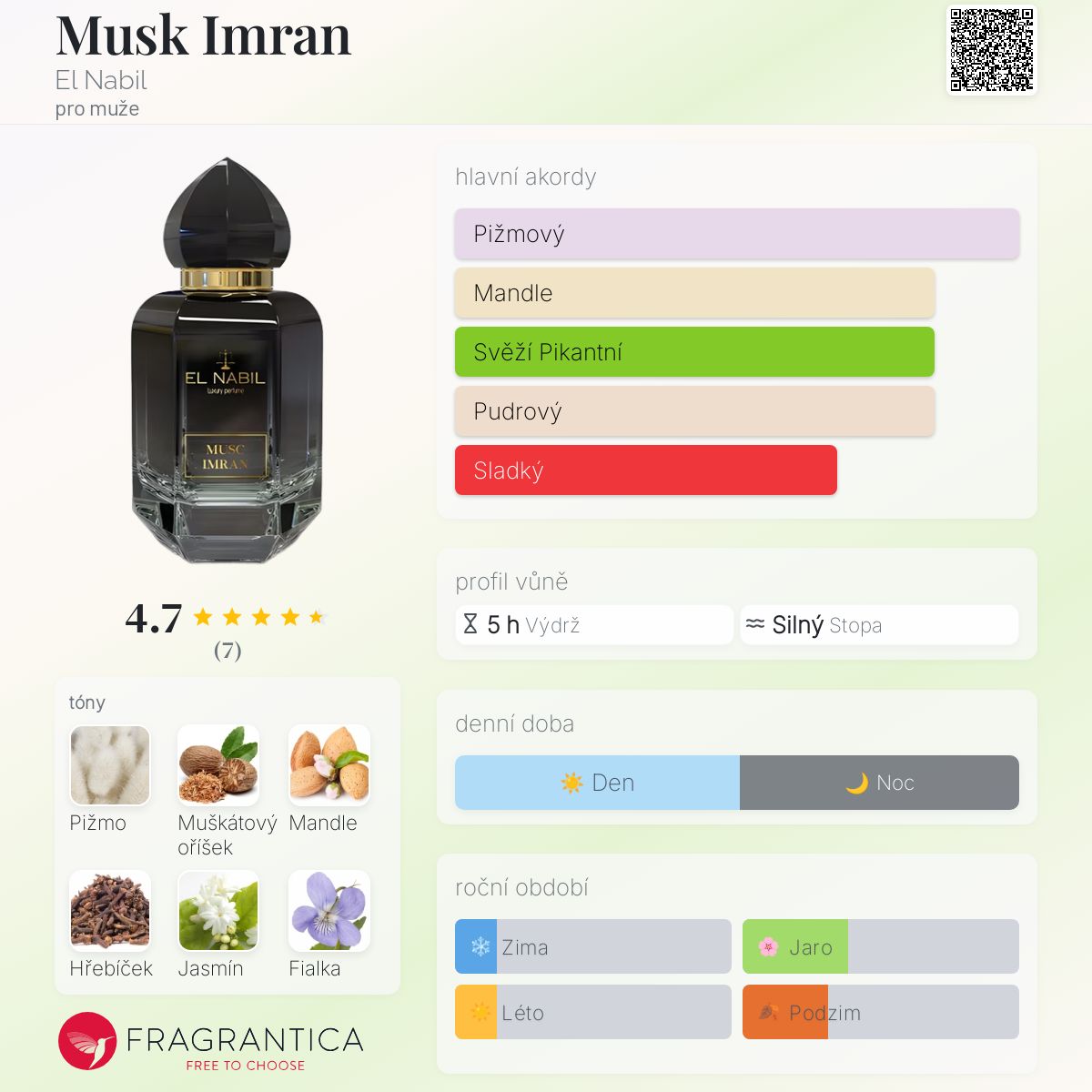 Musk Imran podle El Nabil je Orientální Spicy vůně pro muže. Vrchní tóny jsou Muškátový oříšek, Hřebíček a Citrón; střední tóny jsouMandle, Jasmín a Fialka ; základní tóny jsou Pižmo, Dubový mech a Fazole tonka.