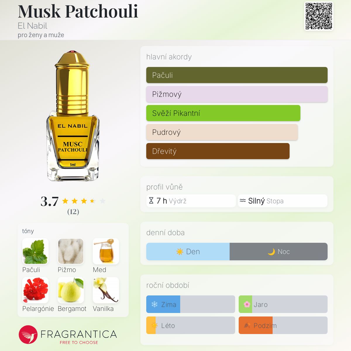 Musk Patchouli podle El Nabil je Woody Floral Musk vůně pro ženy a muže. Vrchní tóny jsou Med, Pelargónie a Bergamot; střední tón jePačuli ; základní tóny jsou Pižmo a Vanilka.