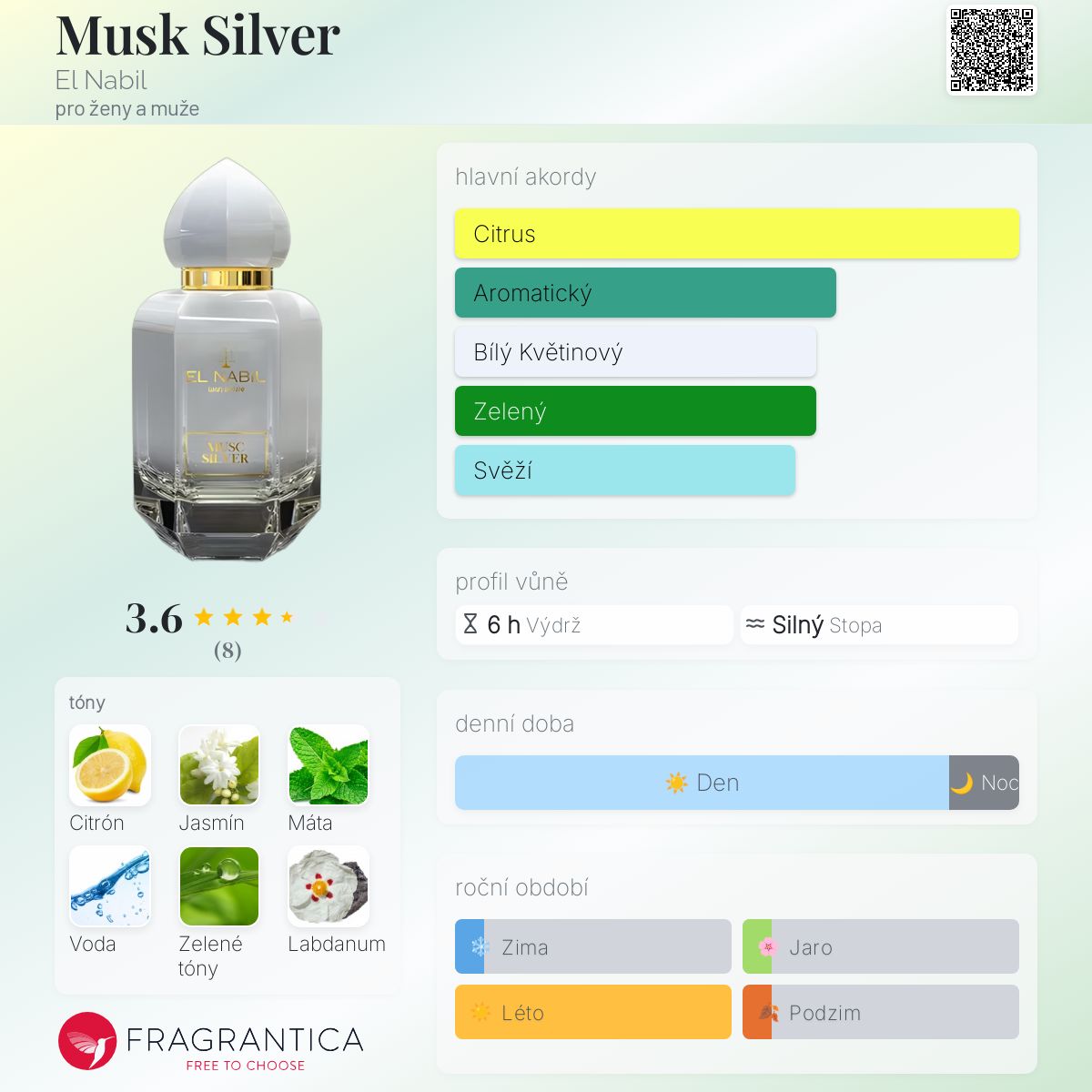 Musk Silver podle El Nabil je Orientální Fougere vůně pro ženy a muže. Vrchní tóny jsou Citrón a Máta; střední tóny jsouJasmín, Vodnaté tóny a Zelené tóny ; základní tóny jsou Labdanum, Cedr, Pižmo a Hnědý cukr.
