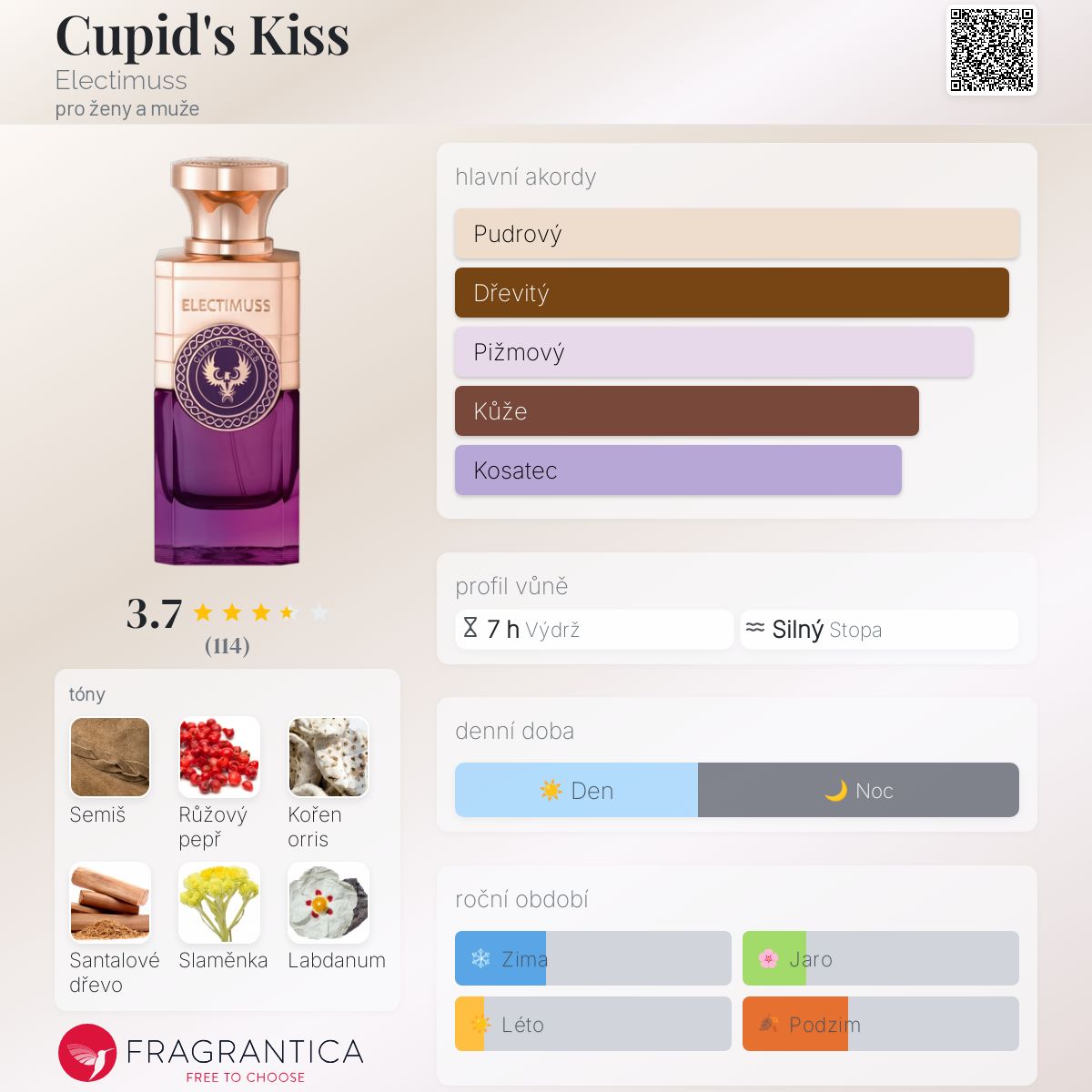 Cupid's Kiss podle Electimuss je Orientální Spicy vůně pro ženy a muže. Toto je nová vůně. Cupid's Kiss byl/a uveden/a v roce 2024. "Nosem" za touto vůní je Julien Rasquinet. Vrchní tóny jsou Růžový pepř a Bergamot; střední tóny jsouOrris a Slaměnka ; základní tóny jsou Semiš, Santalové dřevo, Labdanum a Agarové dřevo (oud).