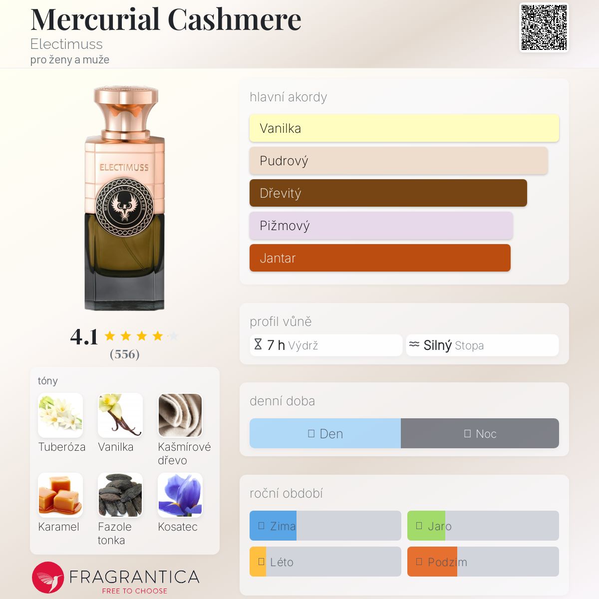 Mercurial Cashmere podle Electimuss je Floral Woody Musk vůně pro ženy a muže. Mercurial Cashmere byl/a uveden/a v roce 2021. "Nosem" za touto vůní je Sofia Bardelli. Vrchní tóny jsou Kardamom, Bergamot a Růžový pepř; střední tóny jsouTuberóza, Kosatec, Fialka a Ambra ; základní tóny jsou Vanilka, Karamel, Kašmírové dřevo, Fazole tonka, Pižmo, Cedr a Agarové dřevo (oud).