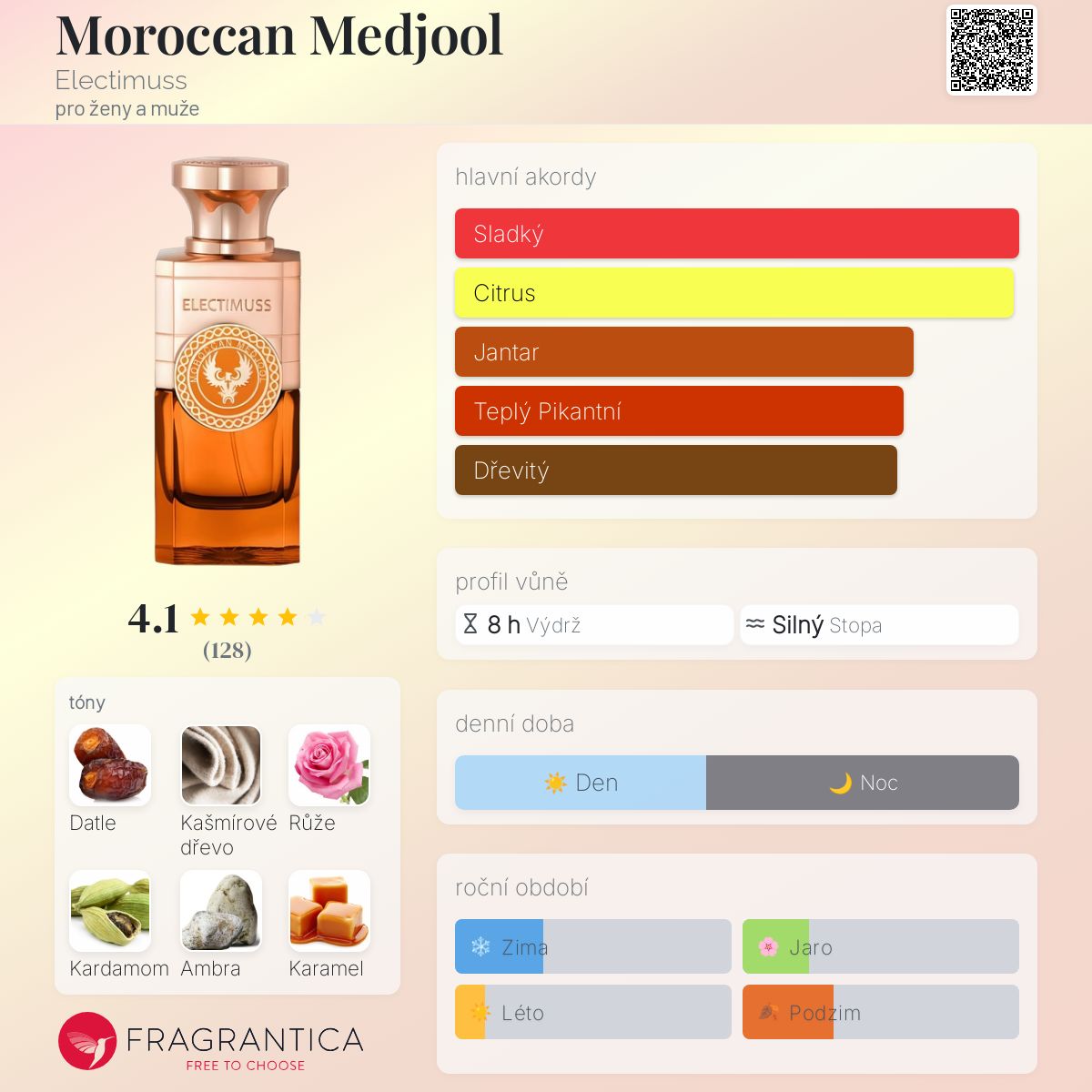 Moroccan Medjool podle Electimuss je Orientální Floral vůně pro ženy a muže. Toto je nová vůně. Moroccan Medjool byl/a uveden/a v roce 2025. Vrchní tóny jsou Datle, Kardamom, Grapefruit, Citrón a Bergamot; střední tóny jsouDatle, Růže, Jasmín, Karafiát a Ylang-Ylang ; základní tóny jsou Kašmírové dřevo, Karamel, Ambra, Vanilka a Dubový mech.