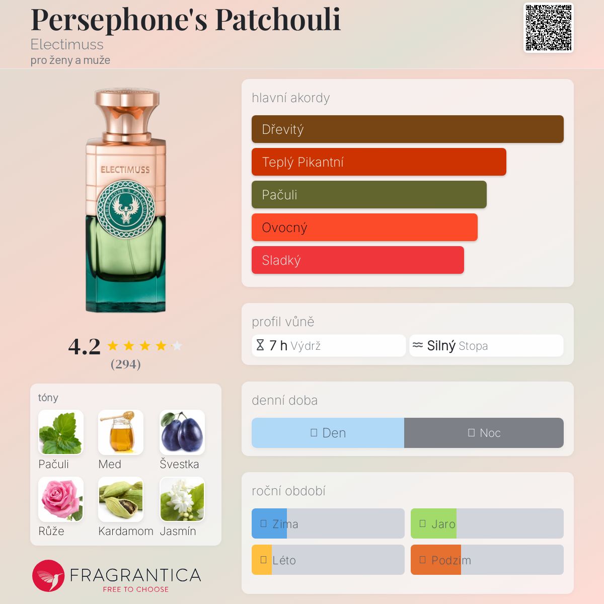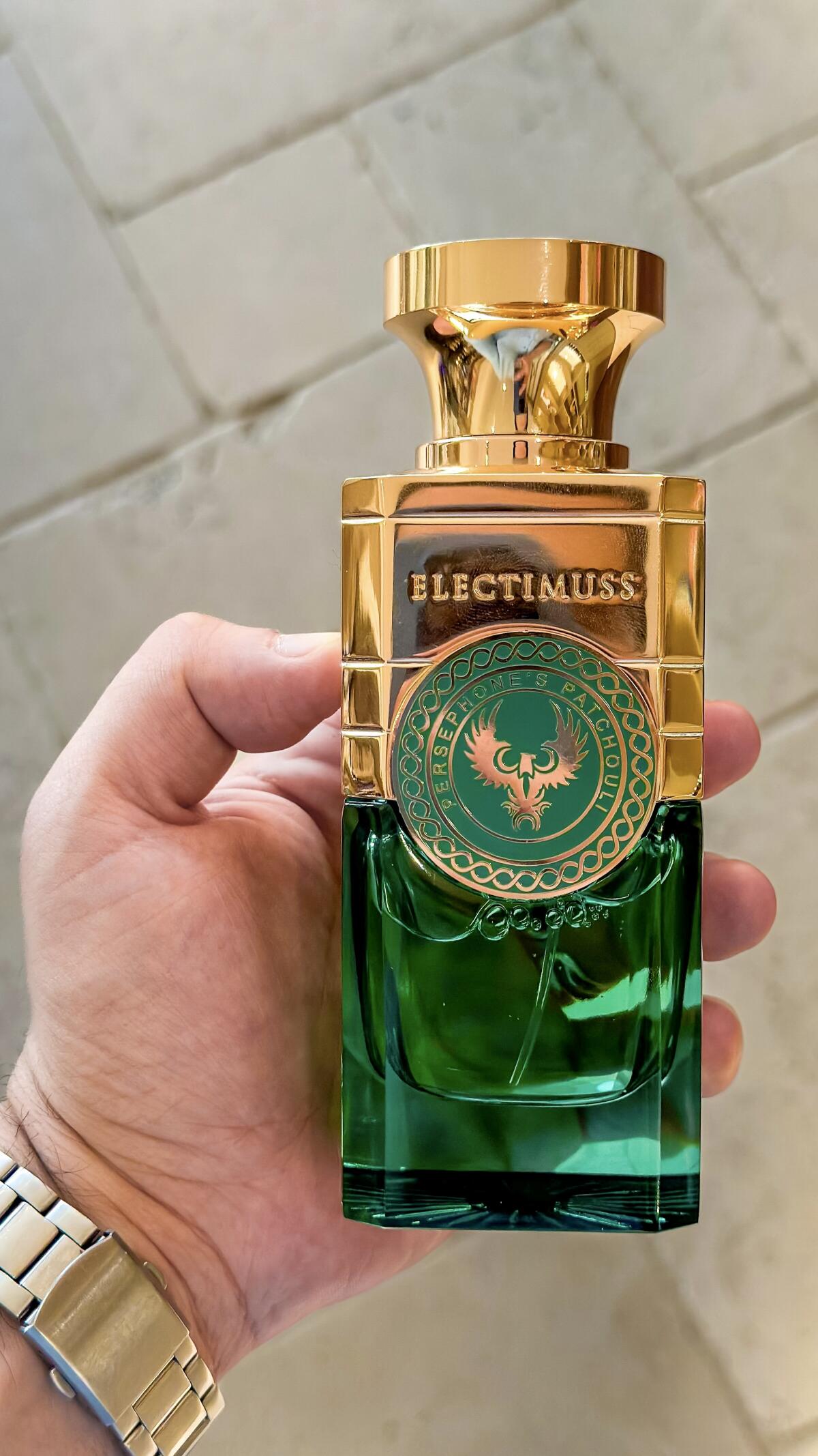 Persephone's Patchouli podle Electimuss je Orientální Woody vůně pro ženy a muže. Persephone's Patchouli byl/a uveden/a v roce 2022. "Nosem" za touto vůní je Christian Provenzano. Vrchní tóny jsou Švestka, Kardamom a Granátové jablko; střední tóny jsouPačuli, Bulharská růže a Egyptský jasmín ; základní tóny jsou Med, Santalové dřevo, Cedr a Ambra.