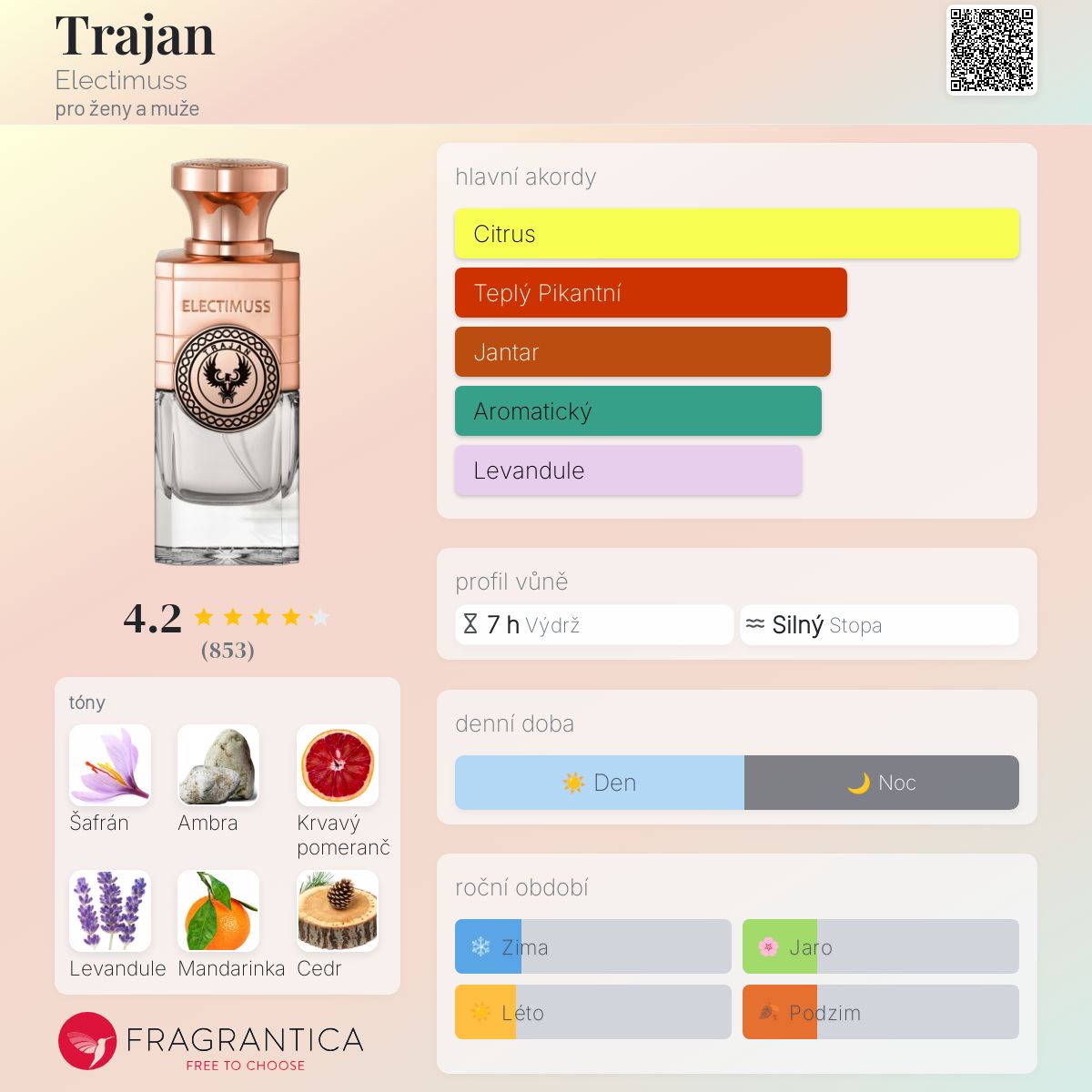 Trajan podle Electimuss je vůně pro ženy a muže. Trajan byl/a uveden/a v roce 2020. Vrchní tóny jsou Krvavý pomeranč, Mandarinka, Citrón a Bergamot; střední tóny jsouŠafrán, Levandule a Šalvěj ; základní tóny jsou Ambra, Cedr a Dubový mech.