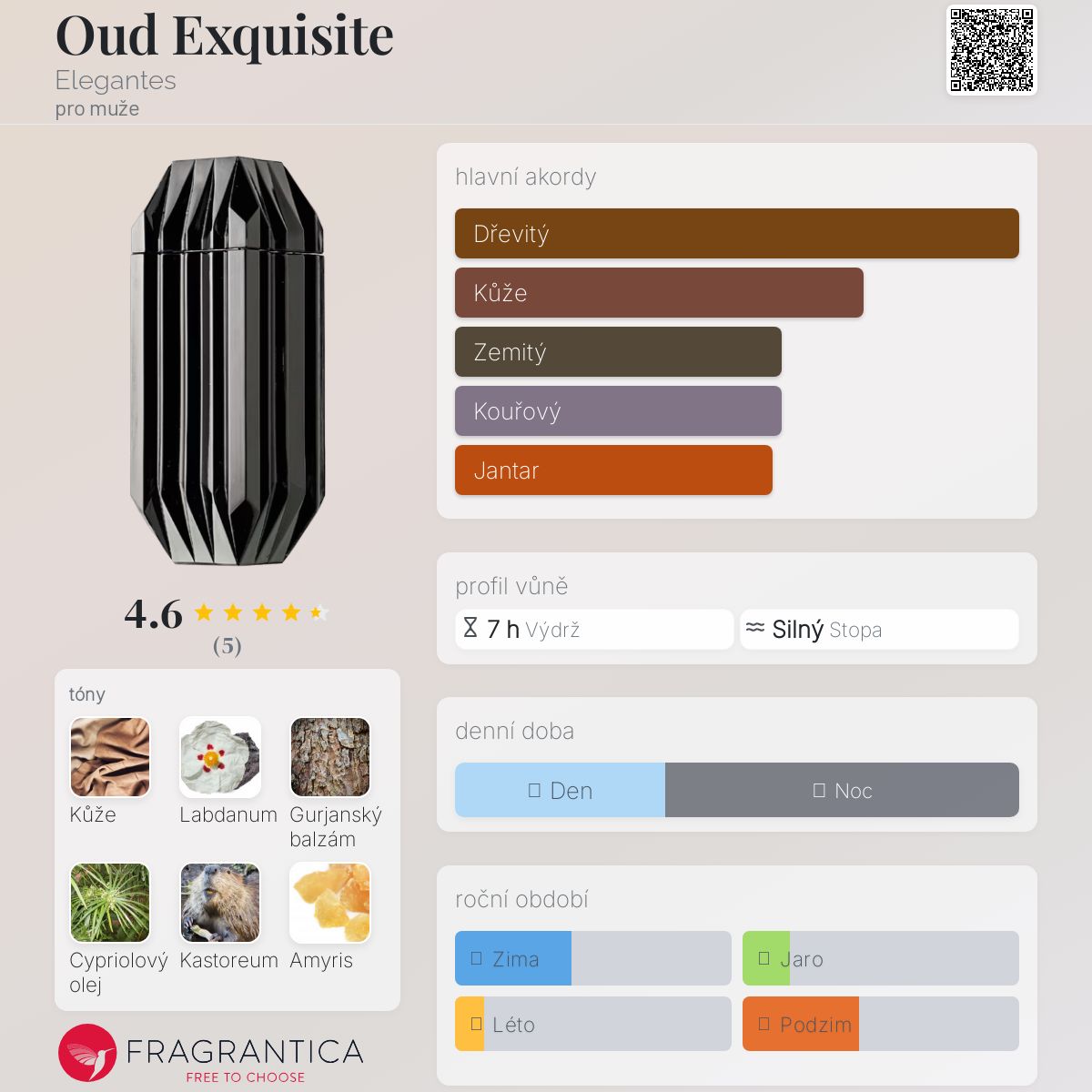 Oud Exquisite podle Elegantes je vůně pro muže. Oud Exquisite byl/a uveden/a v roce 2017. "Nosem" za touto vůní je Julien Rasquinet.