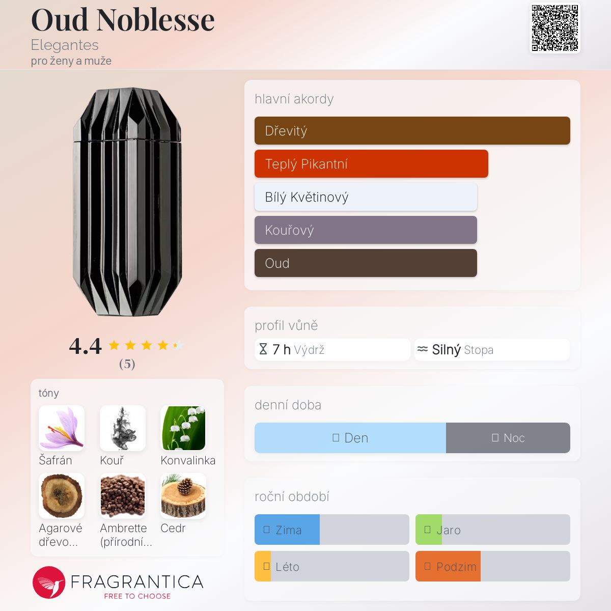 Oud Noblesse podle Elegantes je Orientální Woody vůně pro ženy a muže. Oud Noblesse byl/a uveden/a v roce 2017. "Nosem" za touto vůní je Julien Rasquinet. Vrchní tóny jsou Šafrán a Bergamot; střední tóny jsouKouř, Konvalinka a Ambrette (přírodní pižmo) ; základní tóny jsou Agarové dřevo (oud), Virginský cedr, Ambertonic a Santalové dřevo.