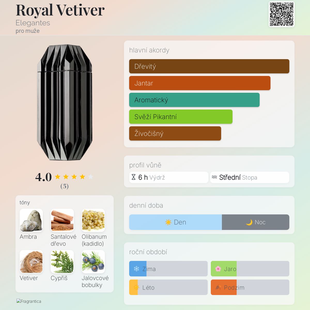 Royal Vetiver podle Elegantes je Woody Aromatic vůně pro muže. Royal Vetiver byl/a uveden/a v roce 2017. "Nosem" za touto vůní je Julien Rasquinet. Vrchní tóny jsou Grapefruit, Růžový pepř a Petitgrain; střední tóny jsouOlibanum, Cypřiš a Jalovcové bobulky ; základní tóny jsou Ambra, Santalové dřevo a Vetiver.
