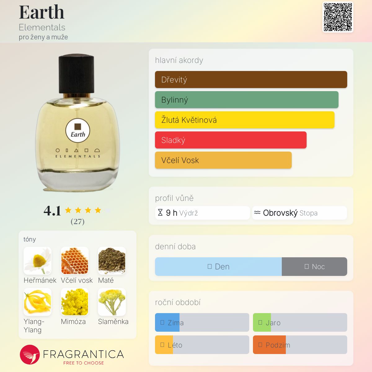 Earth podle Elementals je Woody Floral Musk vůně pro ženy a muže. Earth byl/a uveden/a v roce 2018. Vrchní tóny jsou Heřmánek, Maté, Mimóza a Slaměnka; střední tóny jsouVčelí vosk, Ylang-Ylang, Cypriolový olej a Janovec ; základní tóny jsou Bříza, Guajakové dřevo, Santalové dřevo a Ambra.