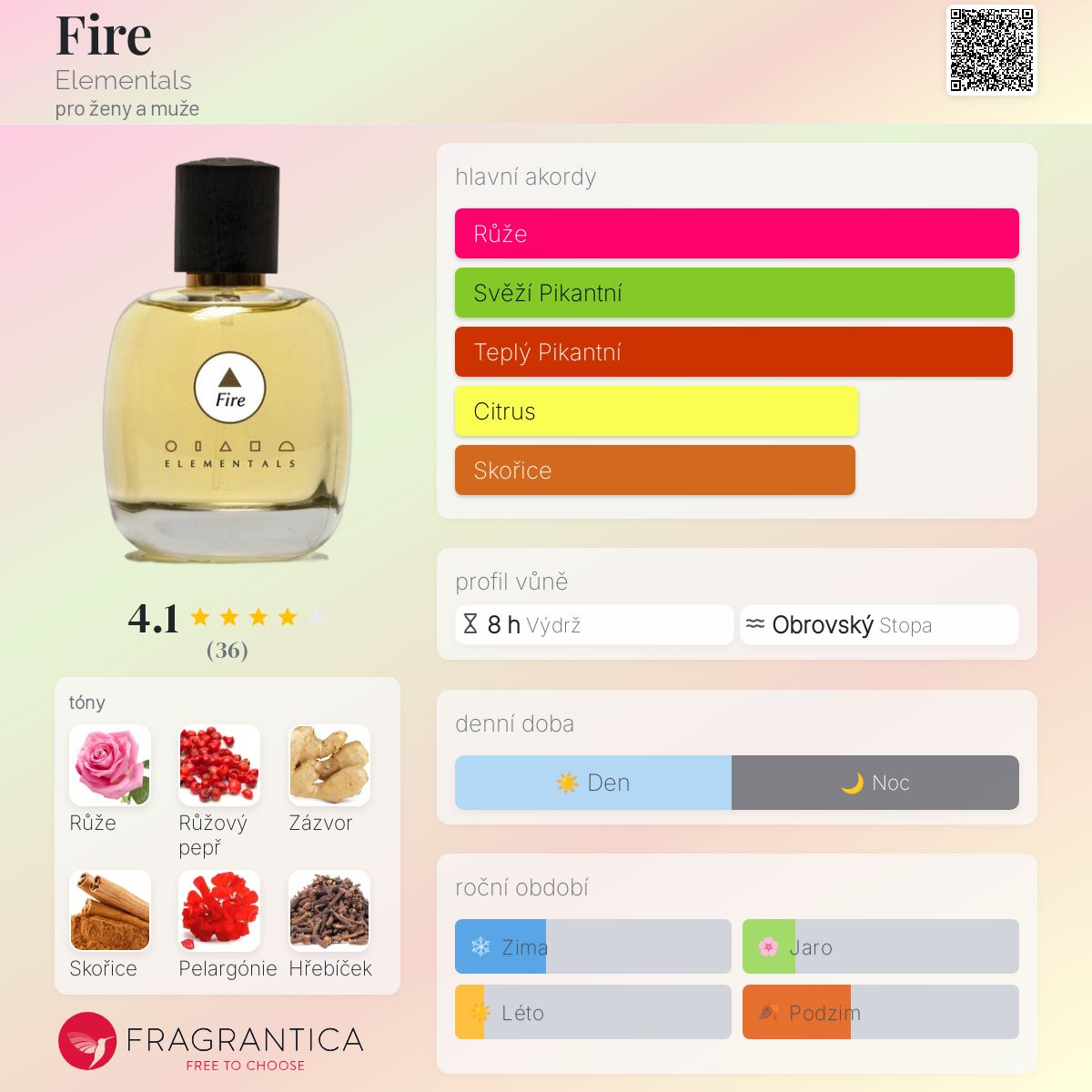 Fire podle Elementals je Orientální Spicy vůně pro ženy a muže. Fire byl/a uveden/a v roce 2018. Vrchní tóny jsou Růžový pepř, Zázvor, Skořice a Hořký pomeranč; střední tóny jsouRůžový olej, Pelargónie, Hřebíček a Neroli ; základní tóny jsou Kadidlo, Labdanum a Yzop.