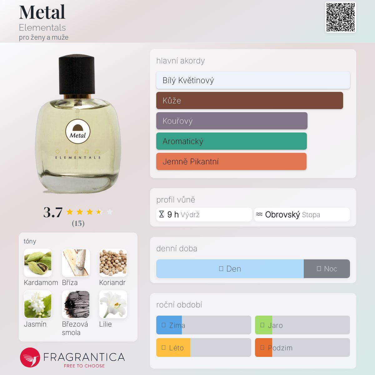 Metal podle Elementals je Floral vůně pro ženy a muže. Metal byl/a uveden/a v roce 2018. Vrchní tóny jsou Kardamom, Koriandr, Březová smola a Fenykl; střední tóny jsouJasmín, Lilie casablanca a Tuberóza ; základní tóny jsou Bříza a Bílé pižmo.