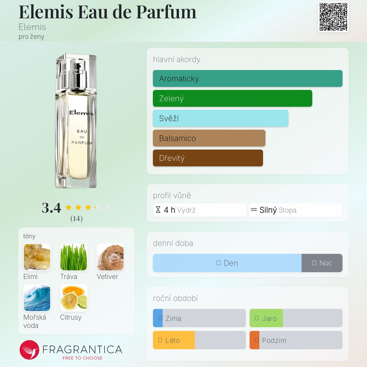 Elemis Eau de Parfum podle Elemis je vůně pro ženy. Elemis Eau de Parfum byl/a uveden/a v roce 2010. Vrchní tóny jsou Elimi, Tráva a Citrusy; střední tón jeMořské tóny ; základní tón je Vetiver.