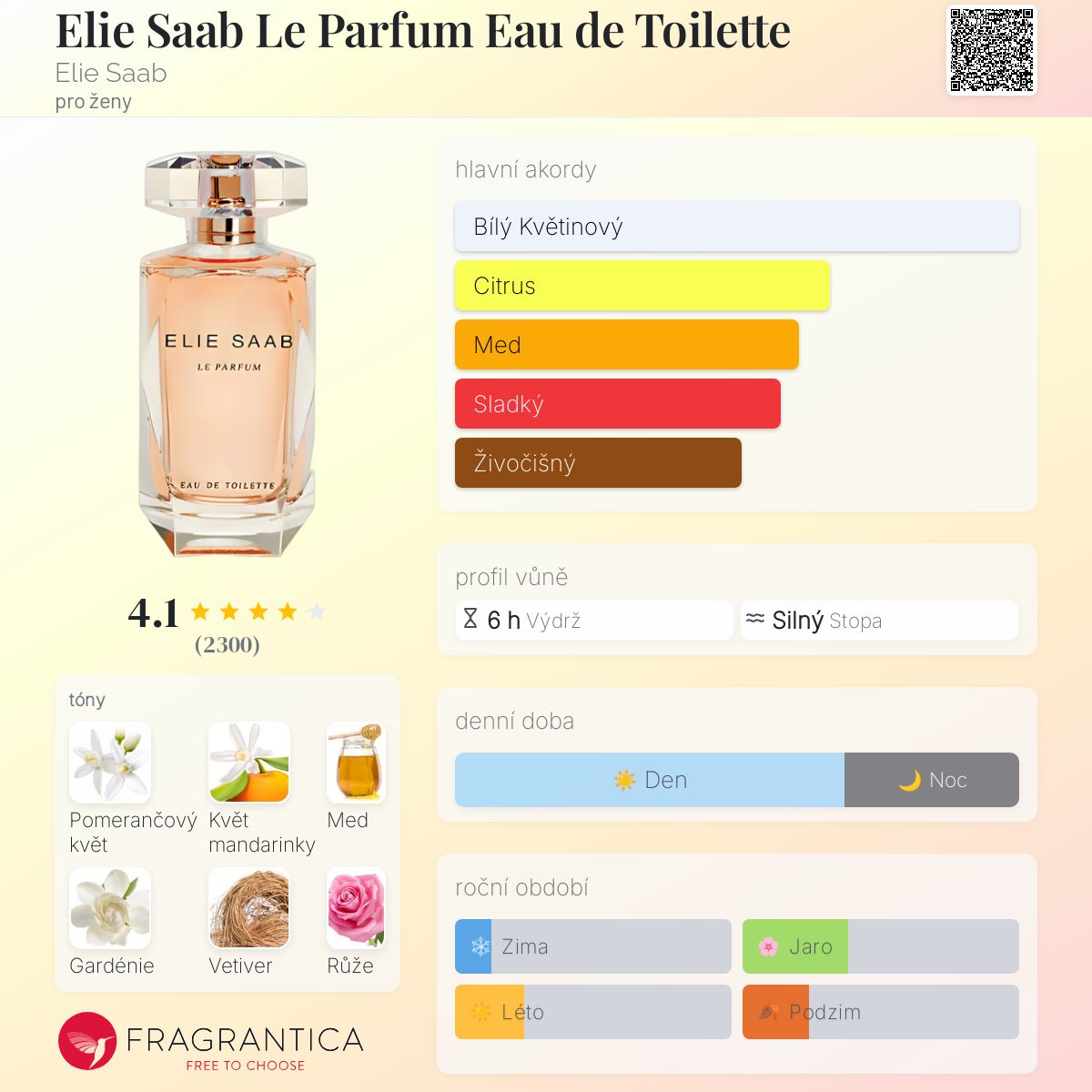 Elie Saab Le Parfum Eau de Toilette podle Elie Saab je Floral vůně pro ženy. Elie Saab Le Parfum Eau de Toilette byl/a uveden/a v roce 2012. "Nosem" za touto vůní je Francis Kurkdjian. Vrchní tón je Mandarinkový květ ; střední tóny jsouPomerančový květ a Gardénie ; základní tóny jsou Med, Vetiver a Růže.