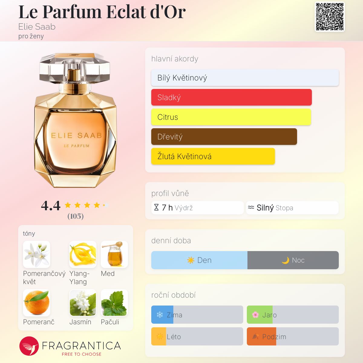 Le Parfum Eclat d'Or podle Elie Saab je Orientální Floral vůně pro ženy. Le Parfum Eclat d'Or byl/a uveden/a v roce 2016. "Nosem" za touto vůní je Francis Kurkdjian. Vrchní tón je Brazilský pomeranč ; střední tóny jsouPomerančový květ, Ylang-Ylang, Med a Jasmín ; základní tóny jsou Pačuli a Vzácné dřevo.