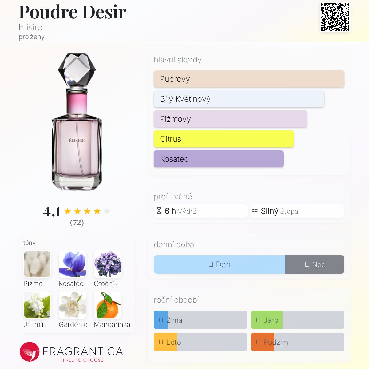 Poudre Desir podle Elisire je Floral vůně pro ženy. Poudre Desir byl/a uveden/a v roce 2015. Poudre Desir byl/a vytvořen/a Alberto Morillas a Franck Salzwedel. Vrchní tóny jsou Mandarinka, Růžový pepř a Kalábrijský bergamot; střední tóny jsouKosatec, Egyptský jasmín, Jasmín a Gardénie ; základní tóny jsou Pižmo, Otočník a Cedr.