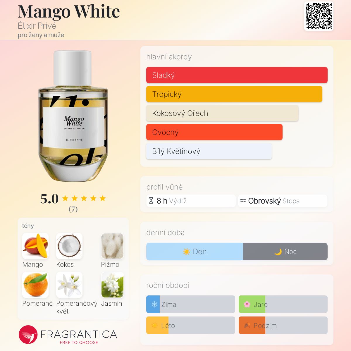 Mango White podle Élixir Privé je Floral Fruity vůně pro ženy a muže. Toto je nová vůně. Mango White byl/a uveden/a v roce 2025. "Nosem" za touto vůní je Pierre Boersch. Vrchní tóny jsou Mango, Pomeranč, Krvavý pomeranč a Ananas; střední tóny jsouPomerančový květ, Jasmín a Rýže ; základní tóny jsou Kokos, Pižmo, Atlasový cedr, Pačuli a Vanilka.