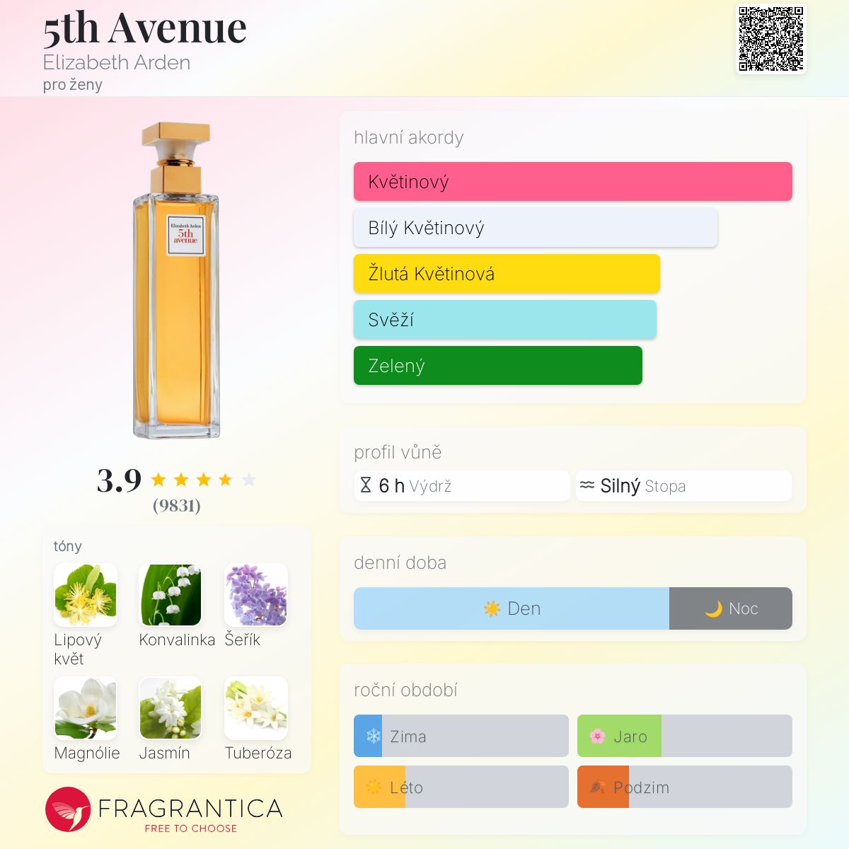 5th Avenue podle Elizabeth Arden je Floral vůně pro ženy. 5th Avenue byl/a uveden/a v roce 1996. "Nosem" za touto vůní je Ann Gottlieb. Vrchní tóny jsou Lipový květ, Konvalinka, Šeřík, Magnólie, Bergamot a Mandarinka; střední tóny jsouJasmín, Tuberóza, Ylang-Ylang, Bulharská růže, Broskev, Fialka, Karafiát a Muškátový oříšek ; základní tóny jsou Pižmo, Kosatec, Santalové dřevo, Jantar (ambra), Vanilka a Hřebíček.