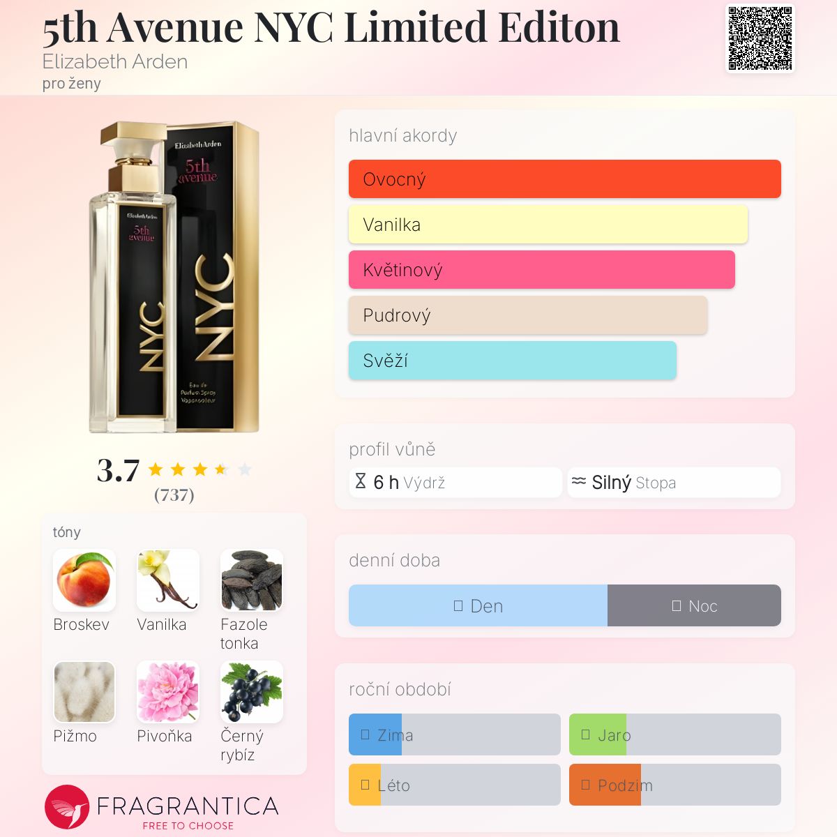 5th Avenue NYC Limited Editon podle Elizabeth Arden je Orientální Floral vůně pro ženy. 5th Avenue NYC Limited Editon byl/a uveden/a v roce 2013. Vrchní tóny jsou Broskev, Jablko a Bergamot; střední tóny jsouPivoňka, Černý rybíz, Jasmín a Švestkové květy ; základní tóny jsou Vanilka, Fazole tonka, Pižmo, Santalové dřevo a Jantar (ambra).
