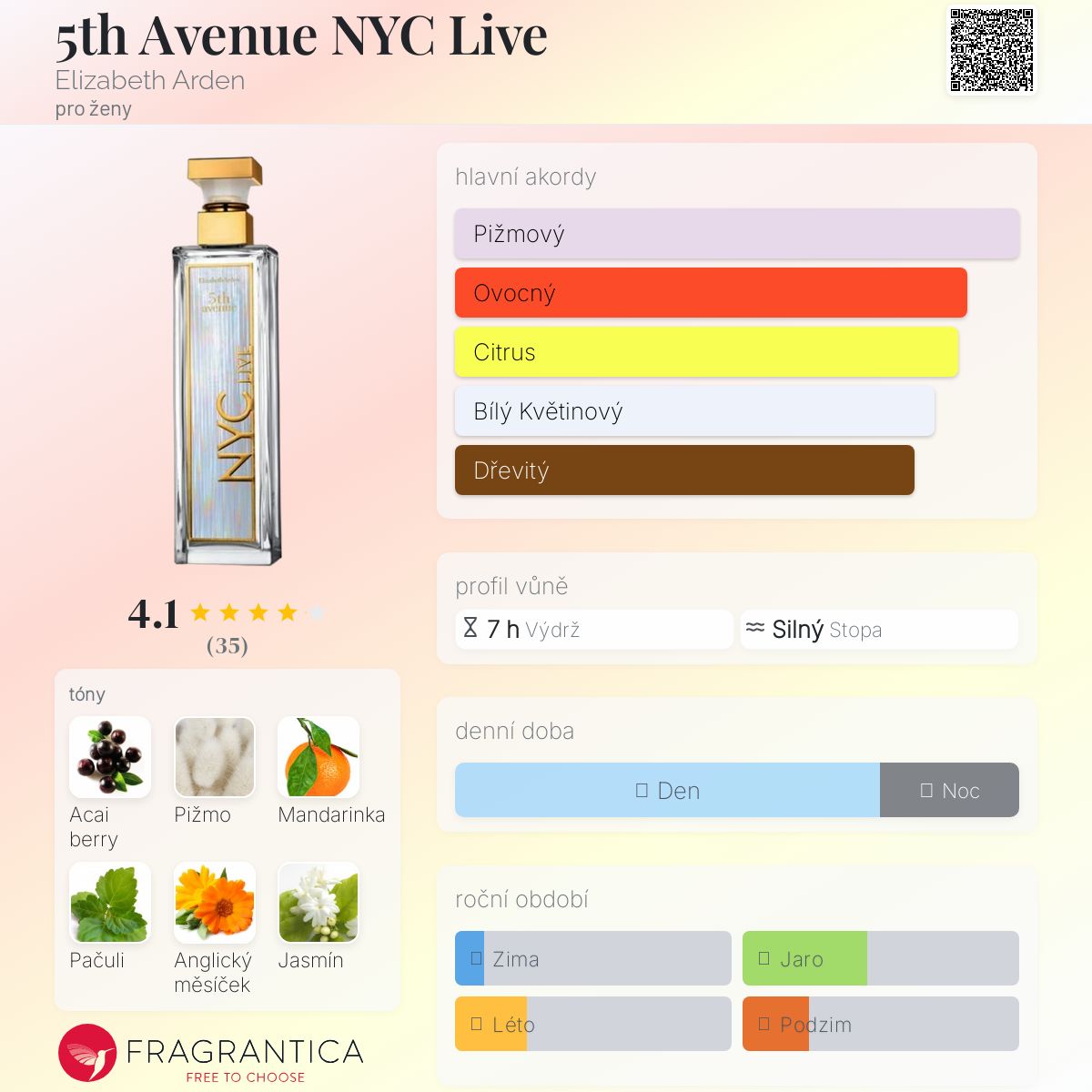 5th Avenue NYC Live podle Elizabeth Arden je Chypre Floral vůně pro ženy. 5th Avenue NYC Live byl/a uveden/a v roce 2018. "Nosem" za touto vůní je Carlos Viñals. Vrchní tóny jsou Acai berry, Mandarinka a Růžový pepř; střední tóny jsouMěsíček, Jasmín Sambac a Neroli ; základní tóny jsou Pižmo, Pačuli a Kašmírové dřevo.