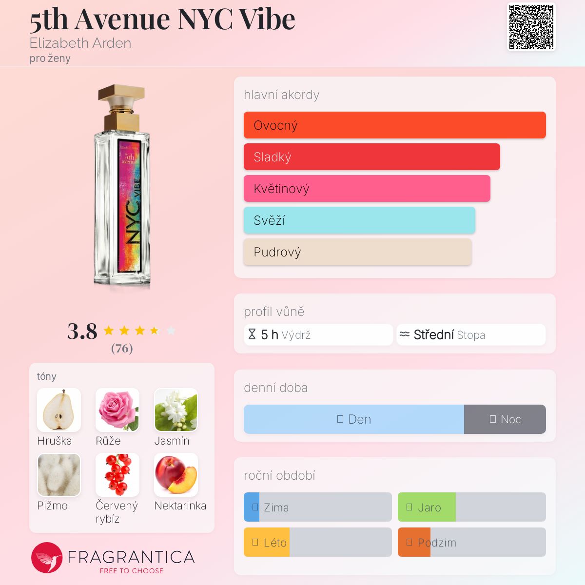 5th Avenue NYC Vibe podle Elizabeth Arden je Floral Woody Musk vůně pro ženy. 5th Avenue NYC Vibe byl/a uveden/a v roce 2021. Vrchní tóny jsou Hruška, Červený rybíz a Nektarinka; střední tóny jsouRůže, Jasmín, Fialka a Frézie ; základní tóny jsou Pižmo, Pačuli, Dřevité tóny a Kokosový nektar.