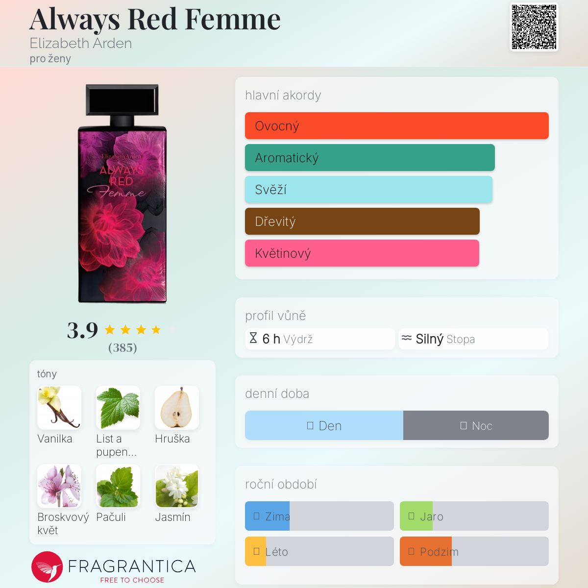 Always Red Femme podle Elizabeth Arden je Orientální Floral vůně pro ženy. Always Red Femme byl/a uveden/a v roce 2016. Vrchní tóny jsou Černý rybíz, Hruška a Citrón; střední tóny jsouBroskvový květ, Jasmín, Pelyněk a Konvalinka ; základní tóny jsou Vanilka, Pačuli, Mech a Cedr.