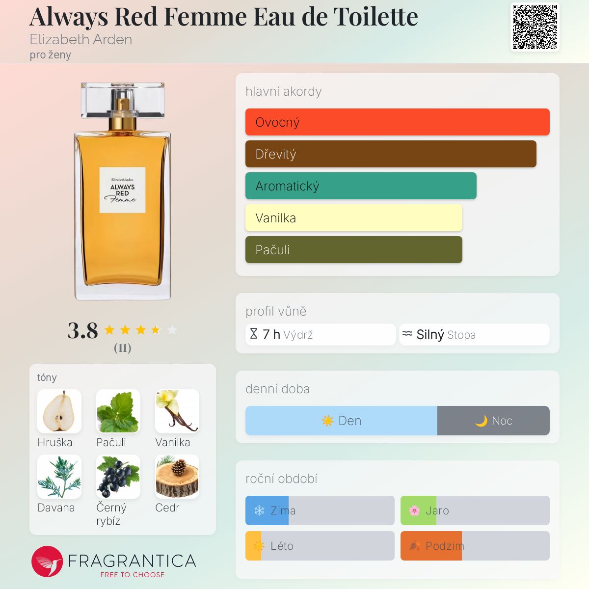 Always Red Femme Eau de Toilette podle Elizabeth Arden je Floral Fruity vůně pro ženy. Toto je nová vůně. Always Red Femme Eau de Toilette byl/a uveden/a v roce 2024. Vrchní tóny jsou Hruška, Černý rybíz a Citrón; střední tóny jsouDavana, Broskvový květ a Jasmín ; základní tóny jsou Pačuli, Vanilka, Cedr a Mech.