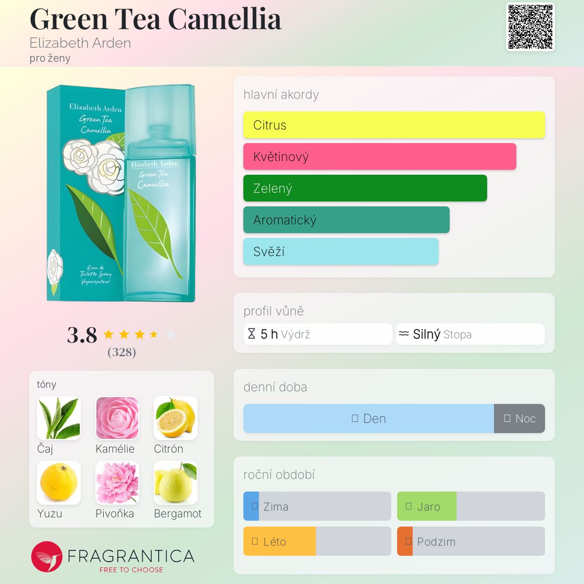 Green Tea Camellia podle Elizabeth Arden je Floral vůně pro ženy. Green Tea Camellia byl/a uveden/a v roce 2011. Vrchní tóny jsou Citron amalfi , Yuzu, Bergamot, Rebarbora, Pomeranč a Kmín; střední tóny jsouČaj, Kamélie, Pivoňka, Magnólie, Jasmín, Máta, Mandarinkový květ, Celerová semínka, Fenykl, Švestka a Hřebíček ; základní tóny jsou Bříza, Koření, Dubový mech, Pižmo a Jantar (ambra).