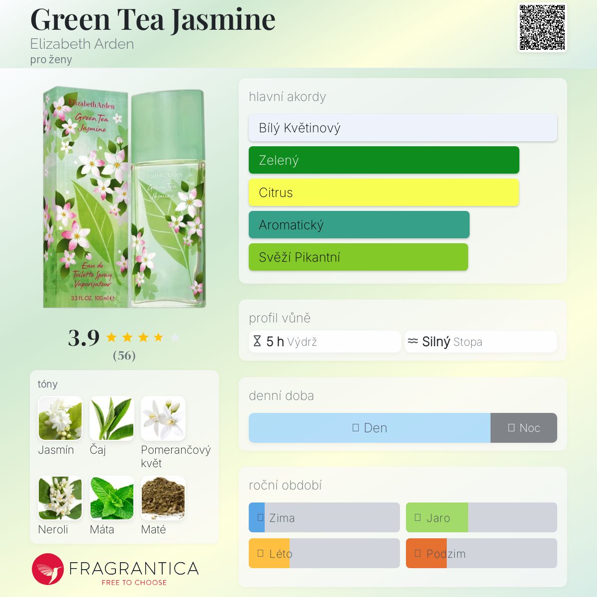 Green Tea Jasmine podle Elizabeth Arden je Floral vůně pro ženy. Green Tea Jasmine byl/a uveden/a v roce 2015. "Nosem" za touto vůní je Rodrigo Flores-Roux. Vrchní tóny jsou Zelený čaj, Tuniské neroli, Máta, Bergamot a Mandarinka; střední tóny jsouJasmín, Pomerančový květ a Fialkový list ; základní tóny jsou Maté, Bílé pižmo a Jantar (ambra).