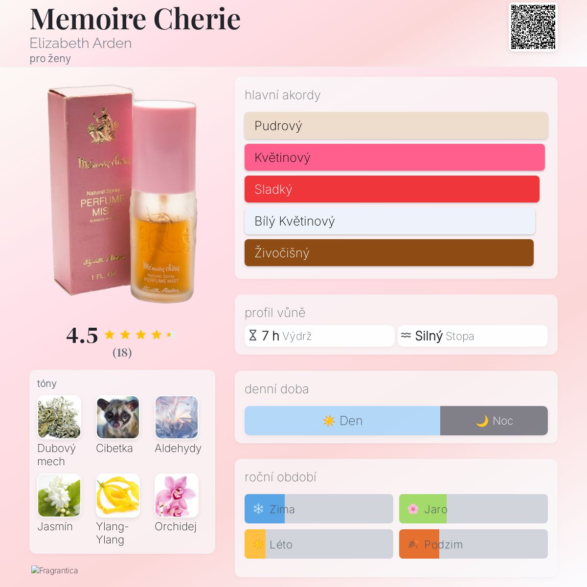 Memoire Cherie podle Elizabeth Arden je Floral Aldehyde vůně pro ženy. Memoire Cherie byl/a uveden/a v roce 1956. Vrchní tóny jsou Aldehydy, Bergamot, Pomerančový květ, Neroli, Meruňka, Mandarinka a Šalvěj muškátová; střední tóny jsouJasmín, Ylang-Ylang, Orchidej, Estragon, Fialka, Med a Karafiát ; základní tóny jsou Dubový mech, Cibetka, Opoponax, Kůže, Pižmo, Jantar (ambra) a Haitský vetiver.