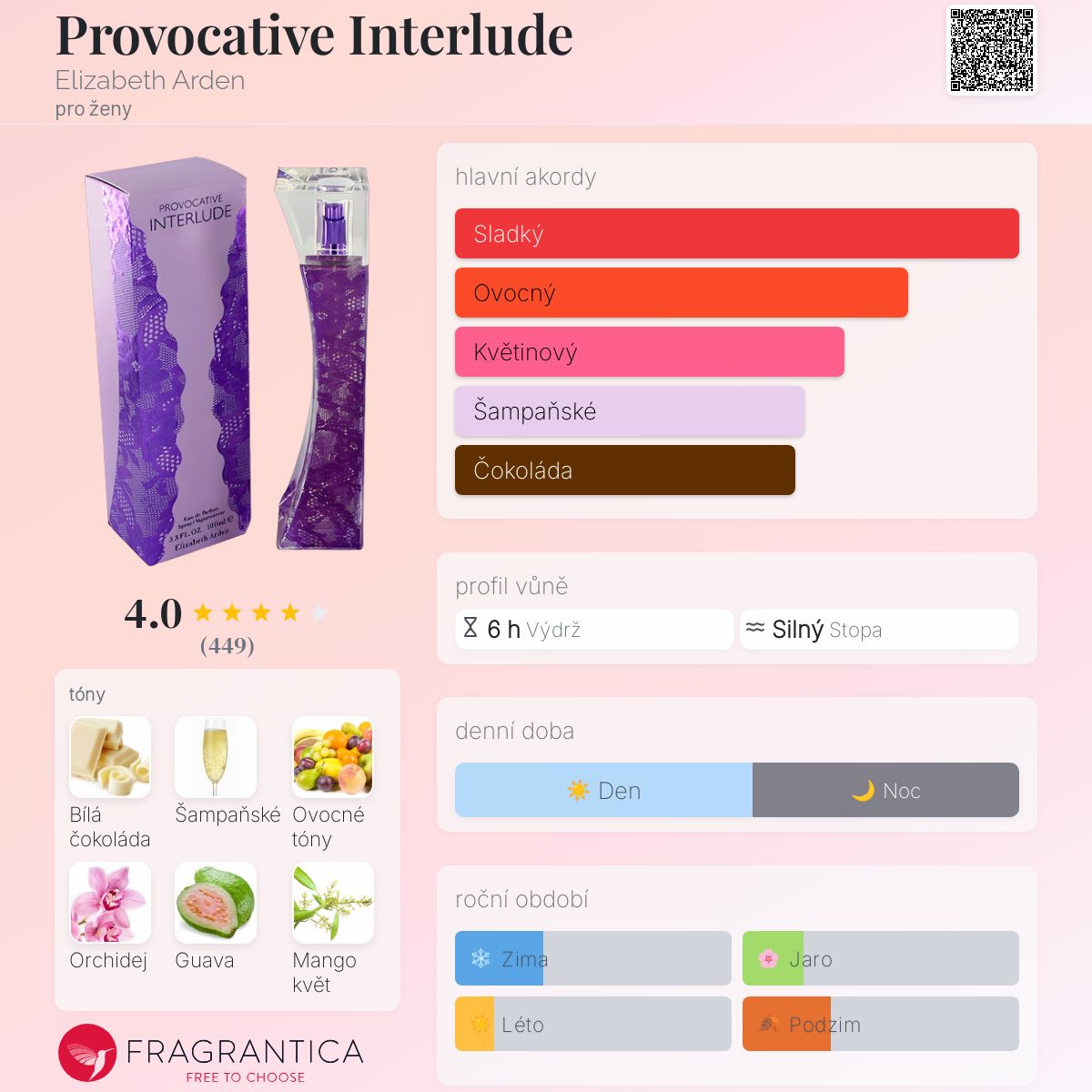 Provocative Interlude podle Elizabeth Arden je Orientální Vanilla vůně pro ženy. Provocative Interlude byl/a uveden/a v roce 2006. Provocative Interlude byl/a vytvořen/a Carlos Benaïm a Loc Dong. Vrchní tóny jsou Šampaňské, Ovoce a Guava; střední tóny jsouOrchidej, Mango květ a Růže ; základní tóny jsou Bílá čokoláda, Kašmírové pižmo a Mahagon.