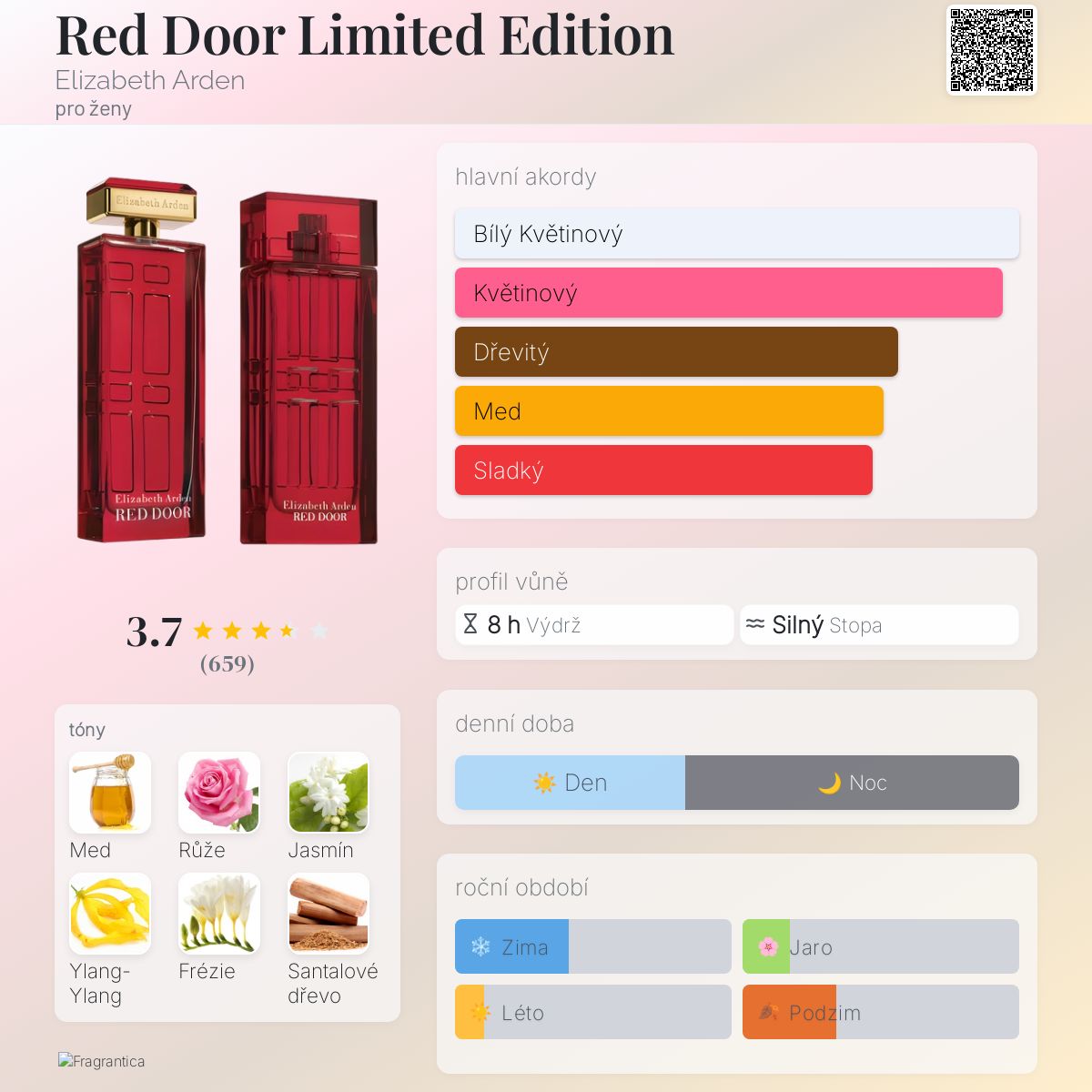 Red Door Limited Edition podle Elizabeth Arden je Orientální Floral vůně pro ženy. Red Door Limited Edition byl/a uveden/a v roce 2011. "Nosem" za touto vůní je Claire Cain Miller. Vrchní tóny jsou Frézie, Konvalinka a Fialka; střední tóny jsouRůže, Jasmín, Ylang-Ylang a Květ afrického pomeranče ; základní tóny jsou Bílý med, Santalové dřevo a Dubový mech.