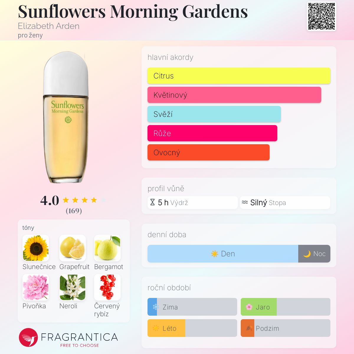 Sunflowers Morning Gardens podle Elizabeth Arden je Floral Woody Musk vůně pro ženy. Sunflowers Morning Gardens byl/a uveden/a v roce 2015. Vrchní tóny jsou Grapefruit, Bergamot, Neroli, Červený rybíz a Růžový pepř; střední tóny jsouSlunečnice, Pivoňka, Růžový olej a Zimolez ; základní tóny jsou Pižmo, Vetiver a Cedr.