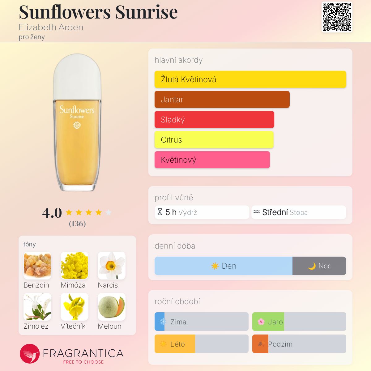 Sunflowers Sunrise podle Elizabeth Arden je Orientální Floral vůně pro ženy. Sunflowers Sunrise byl/a uveden/a v roce 2021. Vrchní tóny jsou Meloun, Bergamot a Mandarinka; střední tóny jsouMimóza, Zimolez a Sedmikráska ; základní tóny jsou Siamský (thajský) benzoin, Narcis a Janovec.