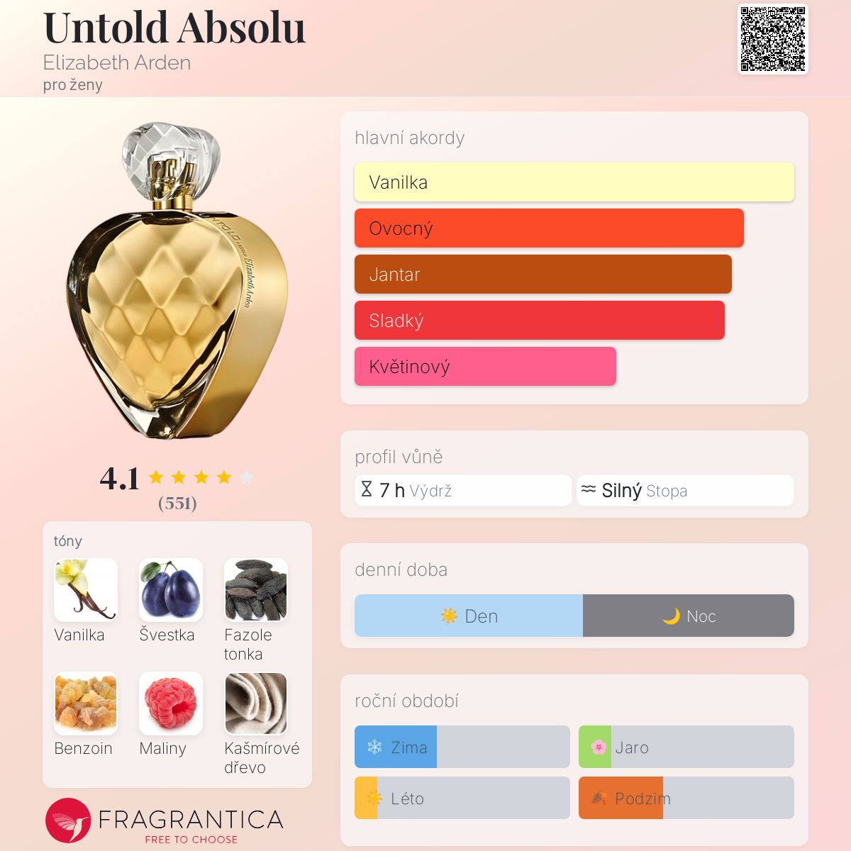 Untold Absolu podle Elizabeth Arden je Floral Fruity vůně pro ženy. Untold Absolu byl/a uveden/a v roce 2014. Vrchní tóny jsou Švestka, Maliny, Zázvor a Bergamot; střední tóny jsouEgyptský jasmín, Květiny a Narcis ; základní tóny jsou Tahitská vanilka, Fazole tonka, Benzoin a Kašmírové dřevo.