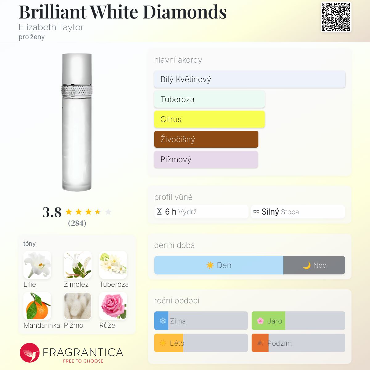 Brilliant White Diamonds podle Elizabeth Taylor je Floral Aldehyde vůně pro ženy. Brilliant White Diamonds byl/a uveden/a v roce 2001. Vrchní tóny jsou Tuberóza a Mandarinka; střední tóny jsouLilie, Zimolez a Bulharská růže ; základní tóny jsou Pižmo, Santalové dřevo a Vanilka.