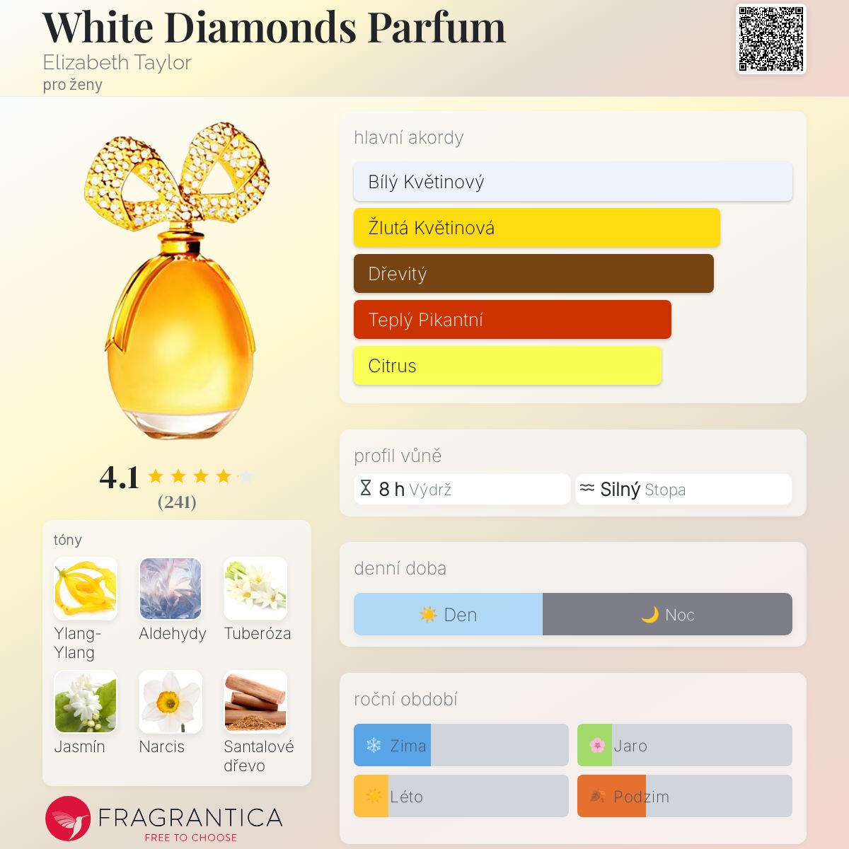 White Diamonds Parfum podle Elizabeth Taylor je Floral Aldehyde vůně pro ženy. White Diamonds Parfum byl/a uveden/a v roce 1991. "Nosem" za touto vůní je Carlos Benaïm. Vrchní tóny jsou Aldehydy, Bílá lilie, Neroli, Pomeranč a Bergamot; střední tóny jsouYlang-Ylang, Tuberóza, Jasmín, Narcis, Kořen kosatce, Skořice, Hřebíček a Turecká růže ; základní tóny jsou Santalové dřevo, Jantar (ambra), Dubový mech, Pižmo a Pačuli.