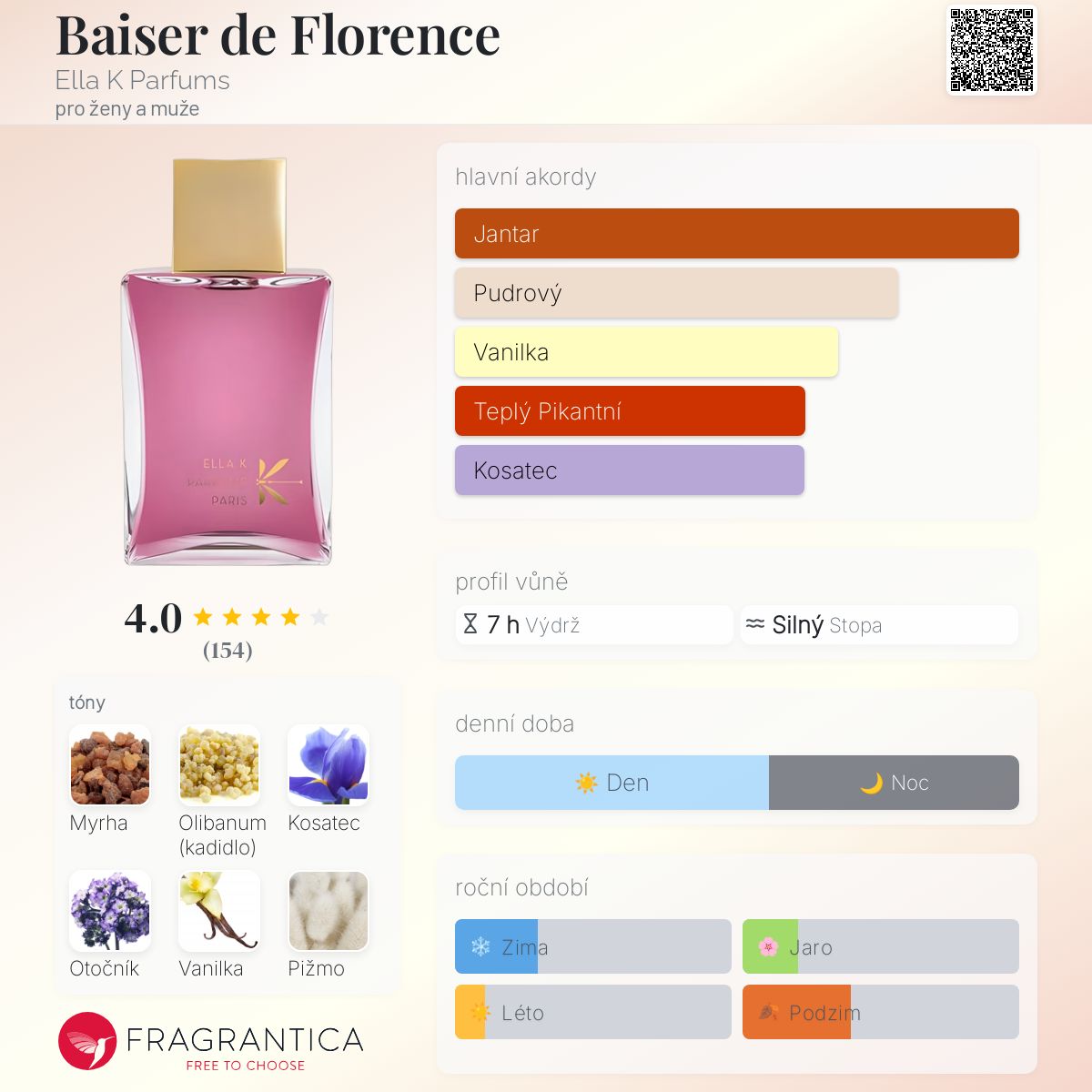 Baiser de Florence podle Ella K Parfums je Floral Woody Musk vůně pro ženy a muže. Baiser de Florence byl/a uveden/a v roce 2018. "Nosem" za touto vůní je Sonia Constant.