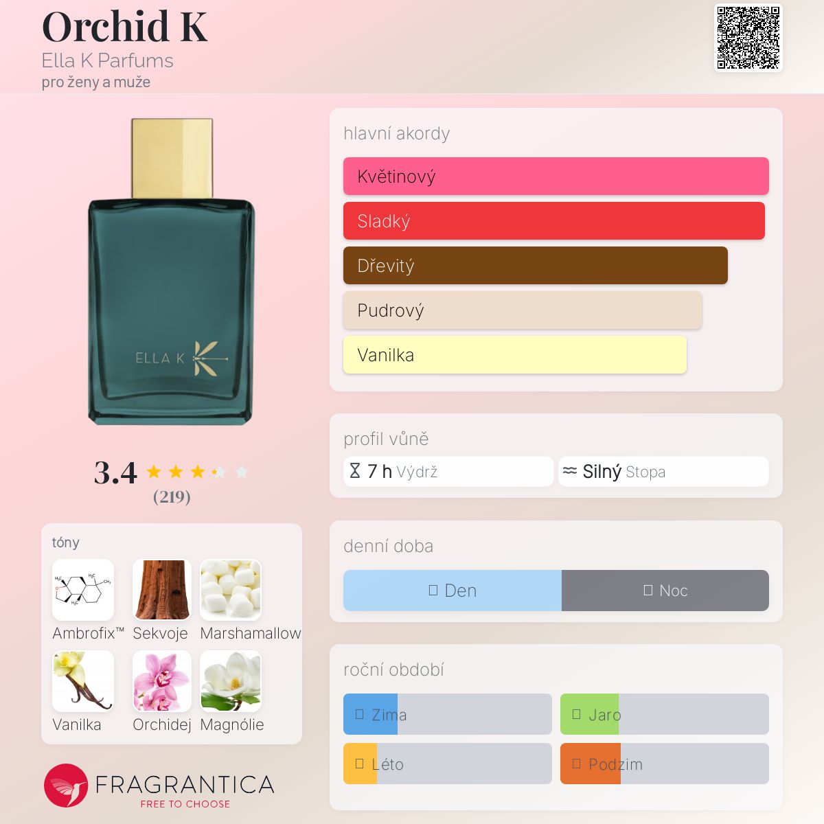 Orchid K podle Ella K Parfums je Floral Fruity Gourmand vůně pro ženy a muže. Toto je nová vůně. Orchid K byl/a uveden/a v roce 2024. "Nosem" za touto vůní je Sonia Constant. Vrchní tóny jsou Marshamallow, Petitgrain a Růžový oleandr; střední tóny jsouČerná orchidej, Magnólie a Divoká růže ; základní tóny jsou Ambrofix™, Sekvoje a Vanilka.
