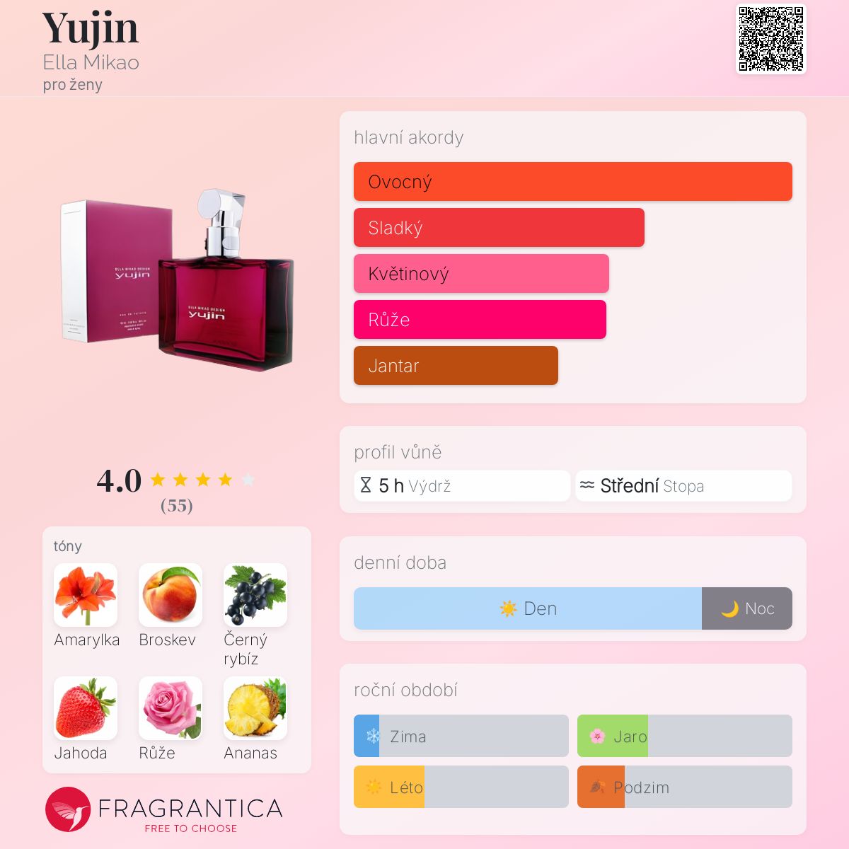 Yujin podle Ella Mikao je Floral Fruity vůně pro ženy. Yujin byl/a uveden/a v roce 2002. Vrchní tóny jsou Amarylka, Broskev a Ananas; střední tóny jsouČerný rybíz, Jahoda a Růže ; základní tóny jsou Jantar (ambra) a Pižmo.