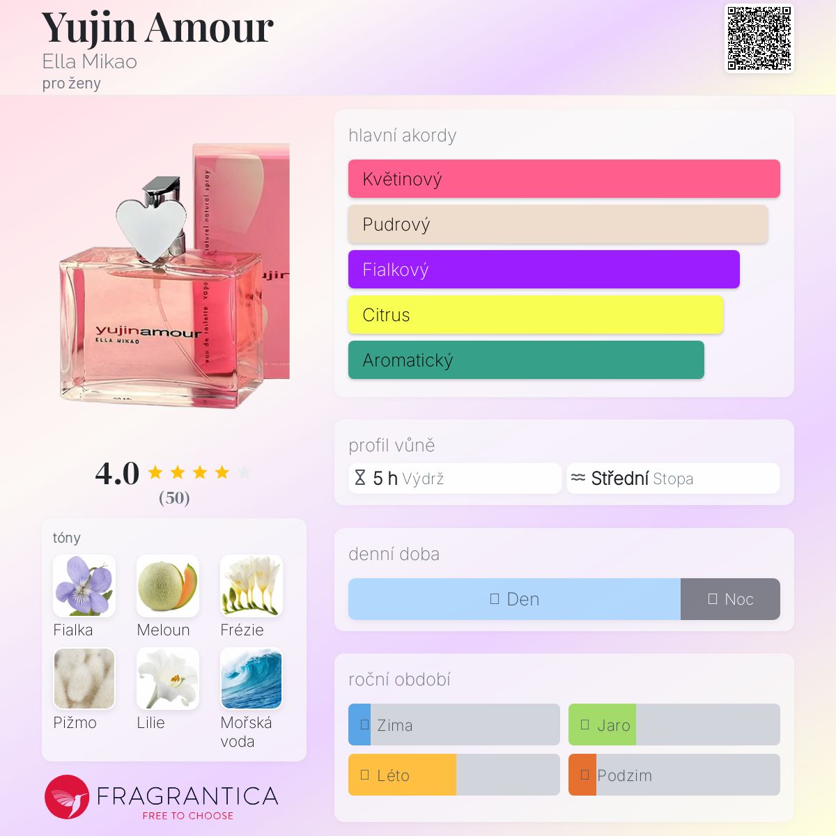 Yujin Amour podle Ella Mikao je Floral Fruity vůně pro ženy. Yujin Amour byl/a uveden/a v roce 2004. Vrchní tóny jsou Meloun, Mandarinka klementina a Grapefruit; střední tóny jsouFialka, Frézie, Lilie a Mořské tóny ; základní tóny jsou Pižmo, Vetiver a Jantar (ambra).