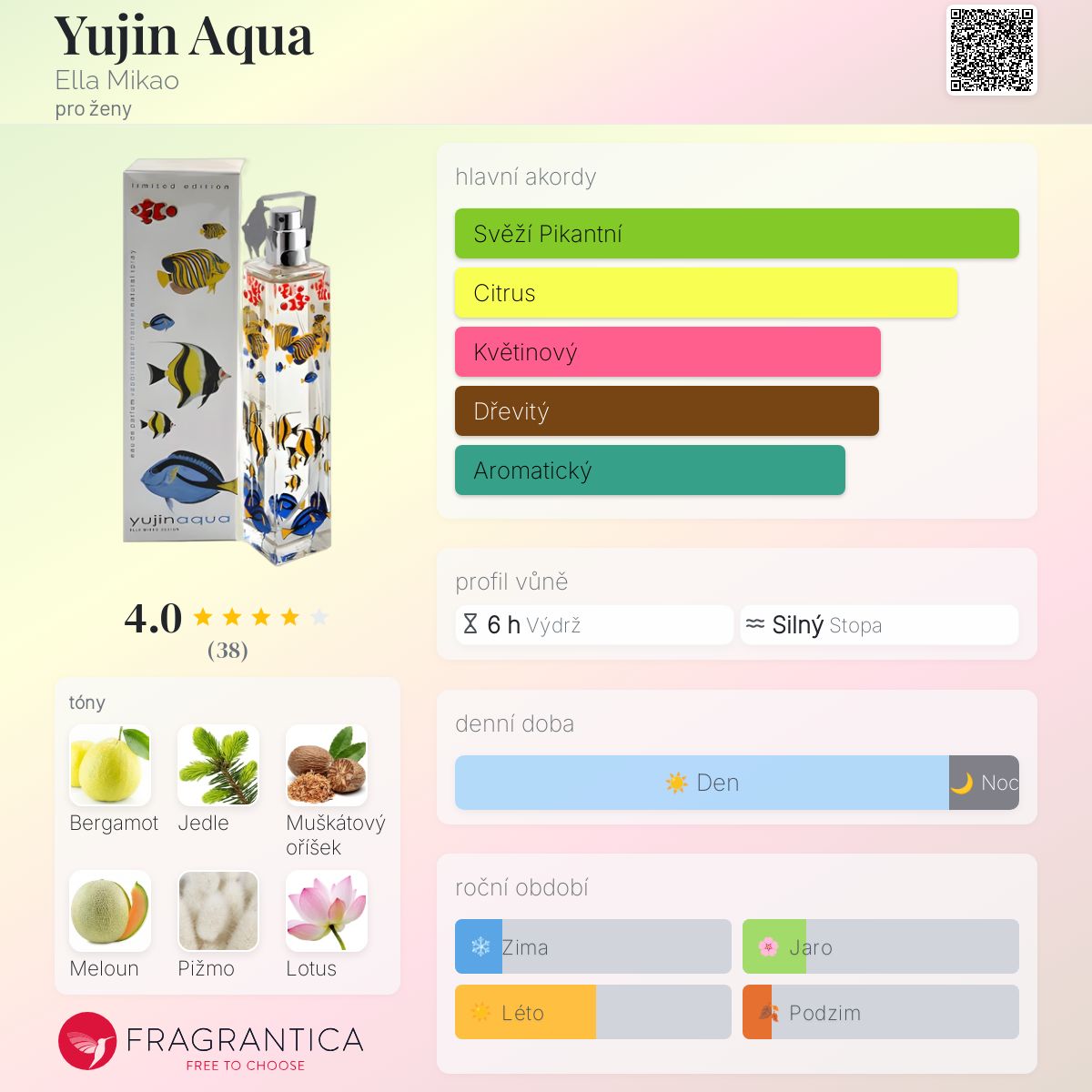 Yujin Aqua podle Ella Mikao je Floral Aquatic vůně pro ženy. Yujin Aqua byl/a uveden/a v roce 2007. Vrchní tóny jsou Bergamot, Citrón a Mandarinka; střední tóny jsouJedlová pryskyřice, Meloun, Lotus, Jasmín a Růže ; základní tóny jsou Muškátový oříšek, Pižmo a Santalové dřevo.