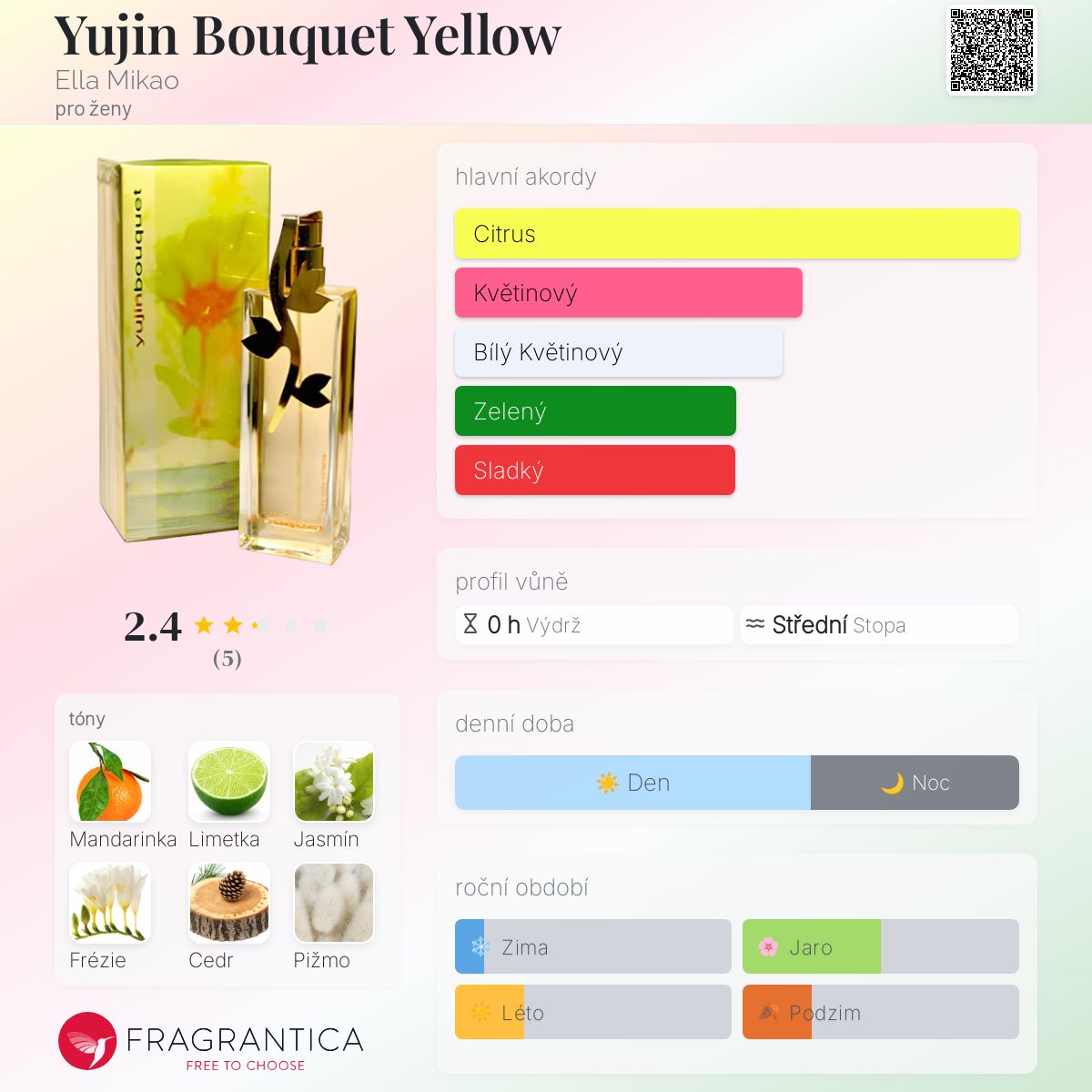 Yujin Bouquet Yellow podle Ella Mikao je Floral Woody Musk vůně pro ženy. Yujin Bouquet Yellow byl/a uveden/a v roce 2008. Vrchní tóny jsou Mandarinka a Limetka; střední tóny jsouEgyptský jasmín, Frézie a Zázvor ; základní tóny jsou Cedr, Pižmo a Jantar (ambra).