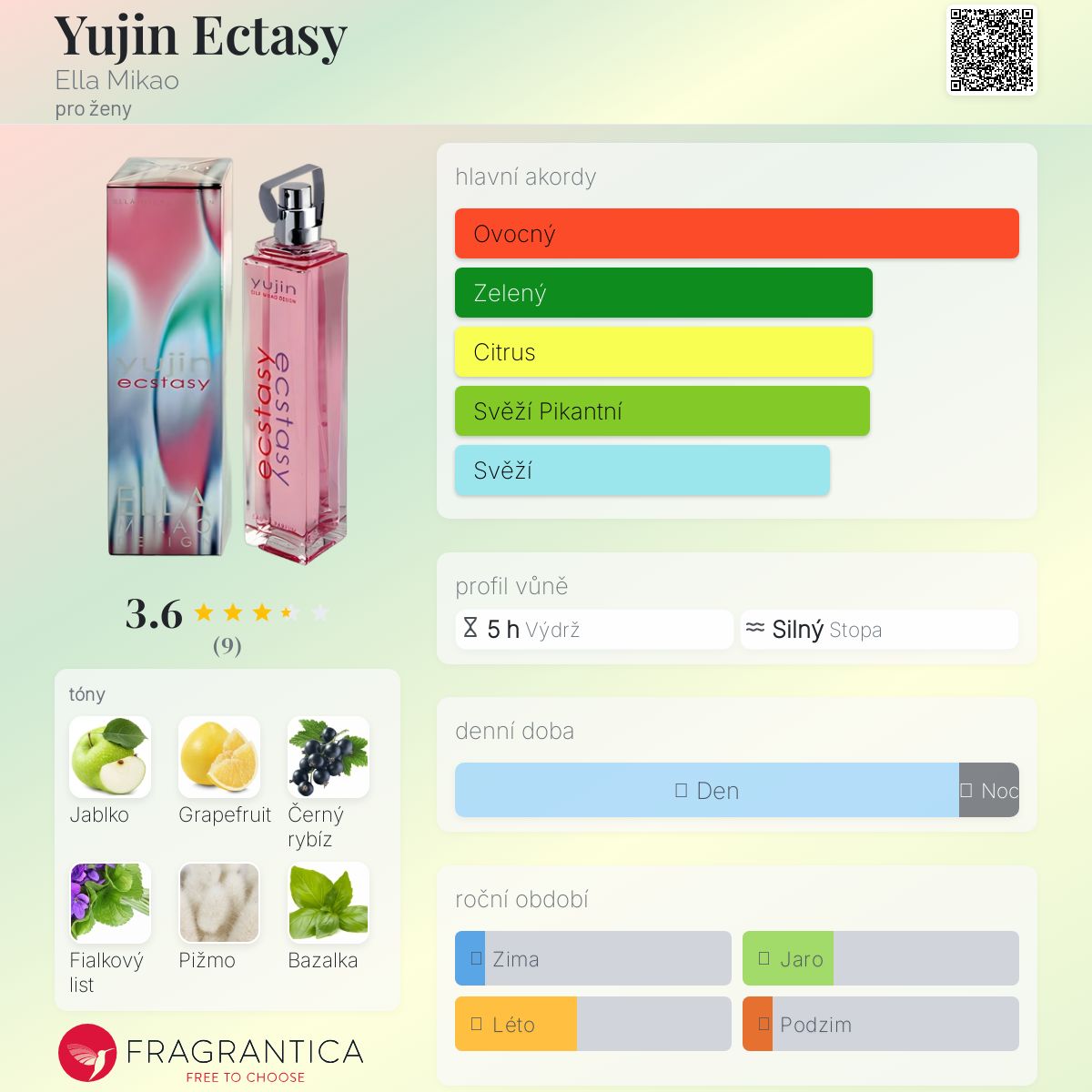 Yujin Ectasy podle Ella Mikao je Floral Fruity vůně pro ženy. Vrchní tóny jsou Krvavý grep a Meloun; střední tóny jsouJablko, Černý rybíz, Fialkový list a Bazalka ; základní tóny jsou Pižmo a Jantar (ambra).