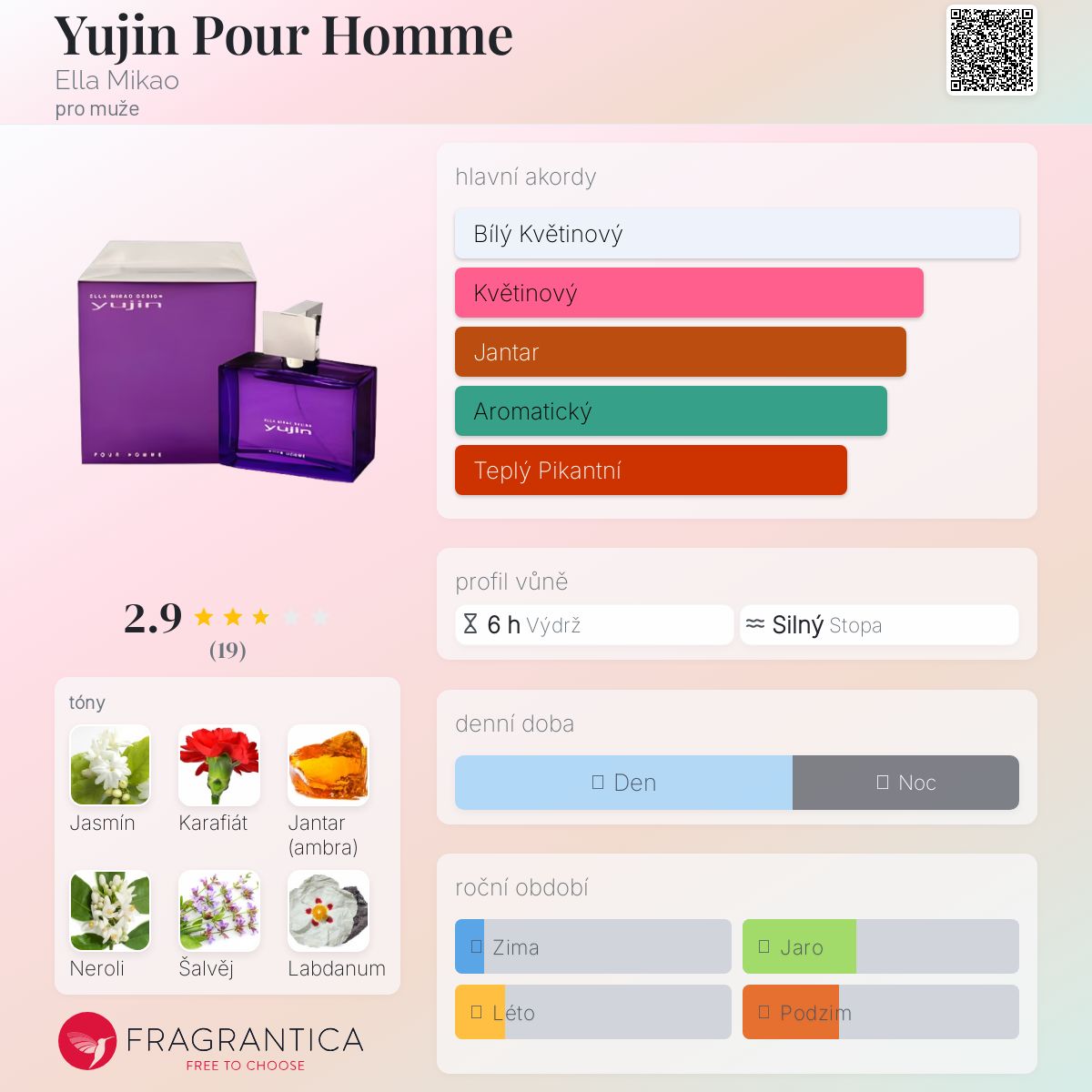 Yujin Pour Homme podle Ella Mikao je Woody Aromatic vůně pro muže. Yujin Pour Homme byl/a uveden/a v roce 2003. Vrchní tóny jsou Šalvěj, Grapefruit, Pepř a Bergamot; střední tóny jsouJasmín, Karafiát, Konvalinka a Pelargónie ; základní tóny jsou Jantar (ambra), Neroli, Labdanum a Dubový mech.