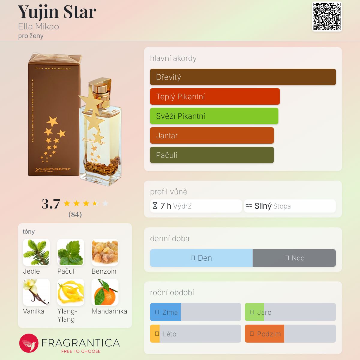 Yujin Star podle Ella Mikao je Floral vůně pro ženy. Yujin Star byl/a uveden/a v roce 2007. Vrchní tóny jsou Mandarinka, Broskev a Bergamot; střední tóny jsouJedle, Ylang-Ylang, Neroli, Kosatec, Jasmín a Růže ; základní tóny jsou Pačuli, Benzoin, Vanilka, Santalové dřevo a Pižmo.