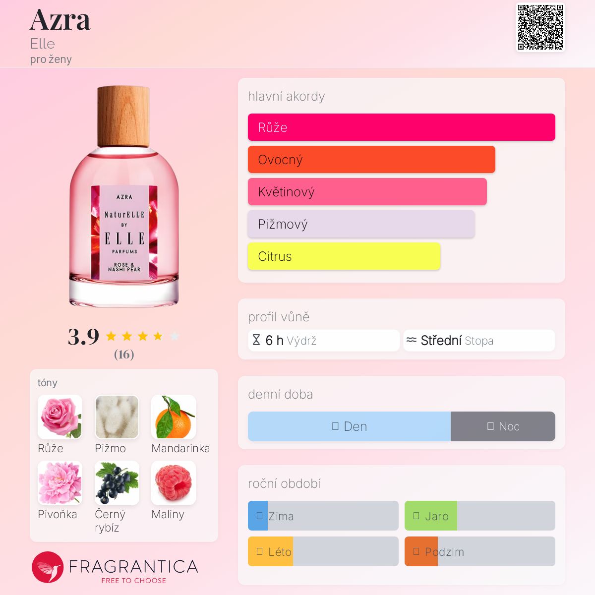 Azra podle Elle je Floral Fruity vůně pro ženy. Azra byl/a uveden/a v roce 2022. Vrchní tóny jsou Mandarinka, Černý rybíz a Maliny; střední tóny jsouTurecký růžový olej, Pivoňka a Nashi hruška ; základní tóny jsou Pižmo a Pačuli.