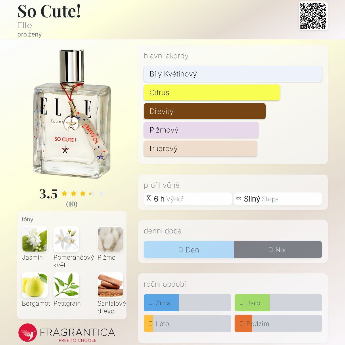 So Cute! podle Elle je Floral Woody Musk vůně pro ženy. So Cute! byl/a uveden/a v roce 2015. Vrchní tóny jsou Bergamot, Petitgrain a Hřebíček; střední tóny jsouJasmín, Pomerančový květ a Frézie ; základní tóny jsou Bílé pižmo, Santalové dřevo a Cedr.