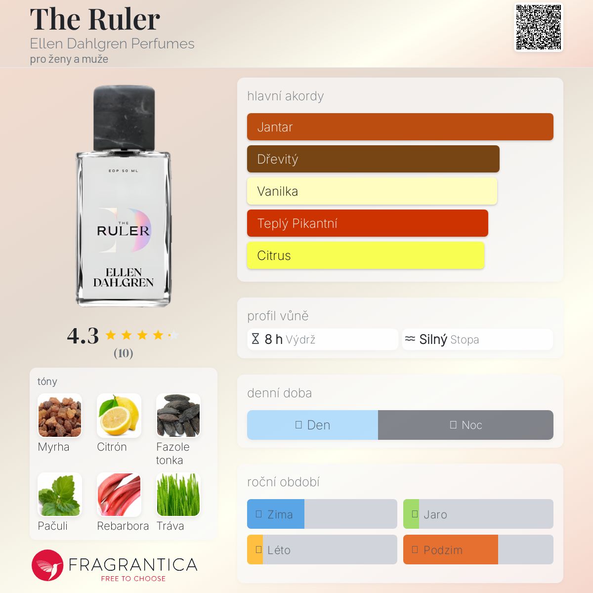 The Ruler podle Ellen Dahlgren Perfumes je vůně pro ženy a muže. The Ruler byl/a uveden/a v roce 2023. "Nosem" za touto vůní je Ellen Dahlgren. Vrchní tóny jsou Citrón, Rebarbora, Tráva a Sladký pomeranč; střední tóny jsouMyrha, Fazole tonka, Cedr, Růže a Kašmírové dřevo ; základní tóny jsou Fazole tonka, Pačuli, Vanilka, Benzoin a Pižmo.