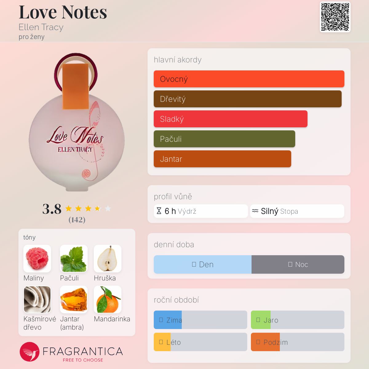 Love Notes podle Ellen Tracy je Floral vůně pro ženy. Vrchní tóny jsou Malinový list, Hruška a Mandarinka; střední tóny jsouExotické květinové tóny a Konvalinka ; základní tóny jsou Pačuli, Kašmírové dřevo, Jantar (ambra) a Santalové dřevo.