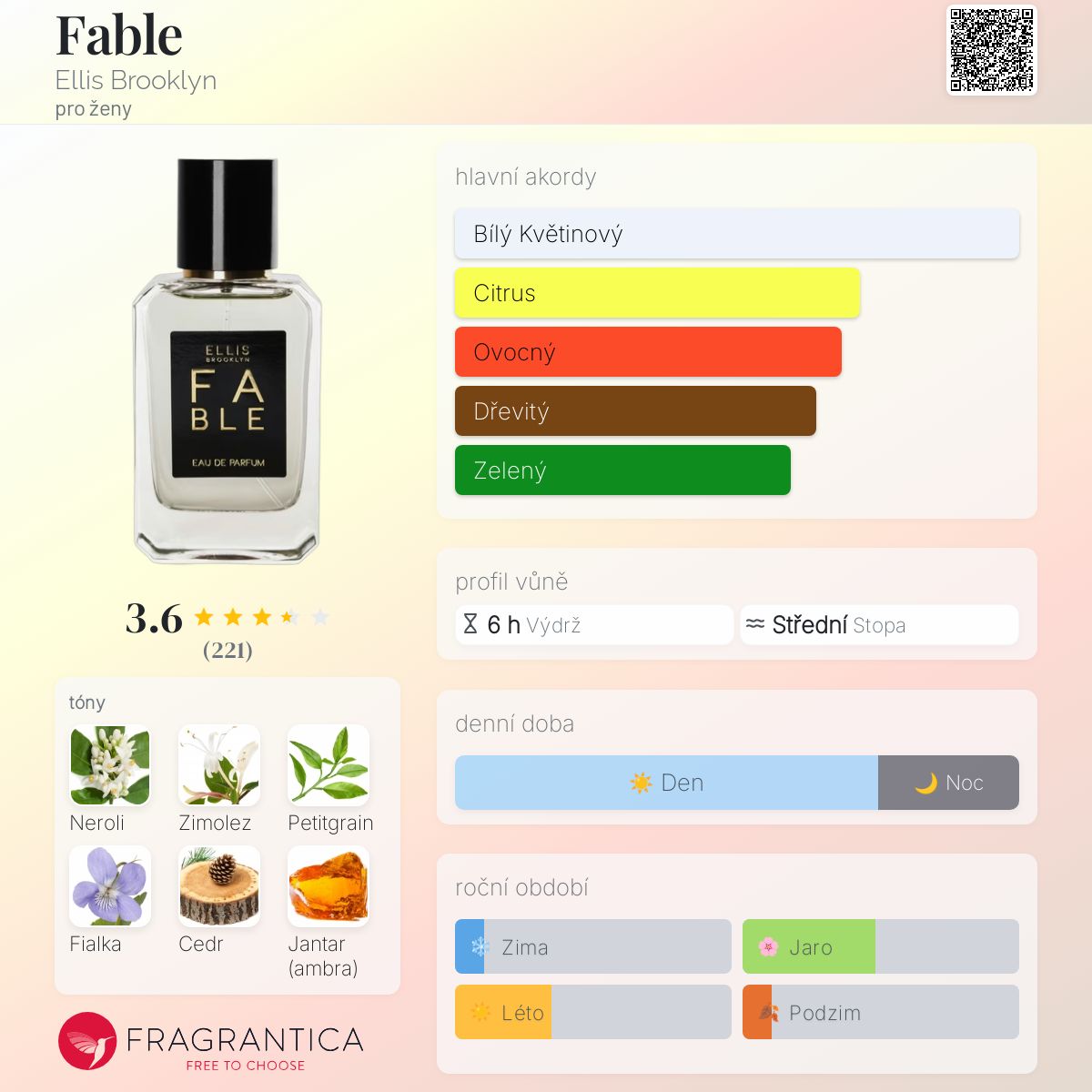 Fable podle Ellis Brooklyn je Floral Woody Musk vůně pro ženy. Fable byl/a uveden/a v roce 2016. "Nosem" za touto vůní je Jérôme Epinette. Vrchní tóny jsou Neroli a Černý rybíz; střední tóny jsouZimolez, Petitgrain a Fialka ; základní tóny jsou Cedr a Jantar (ambra).