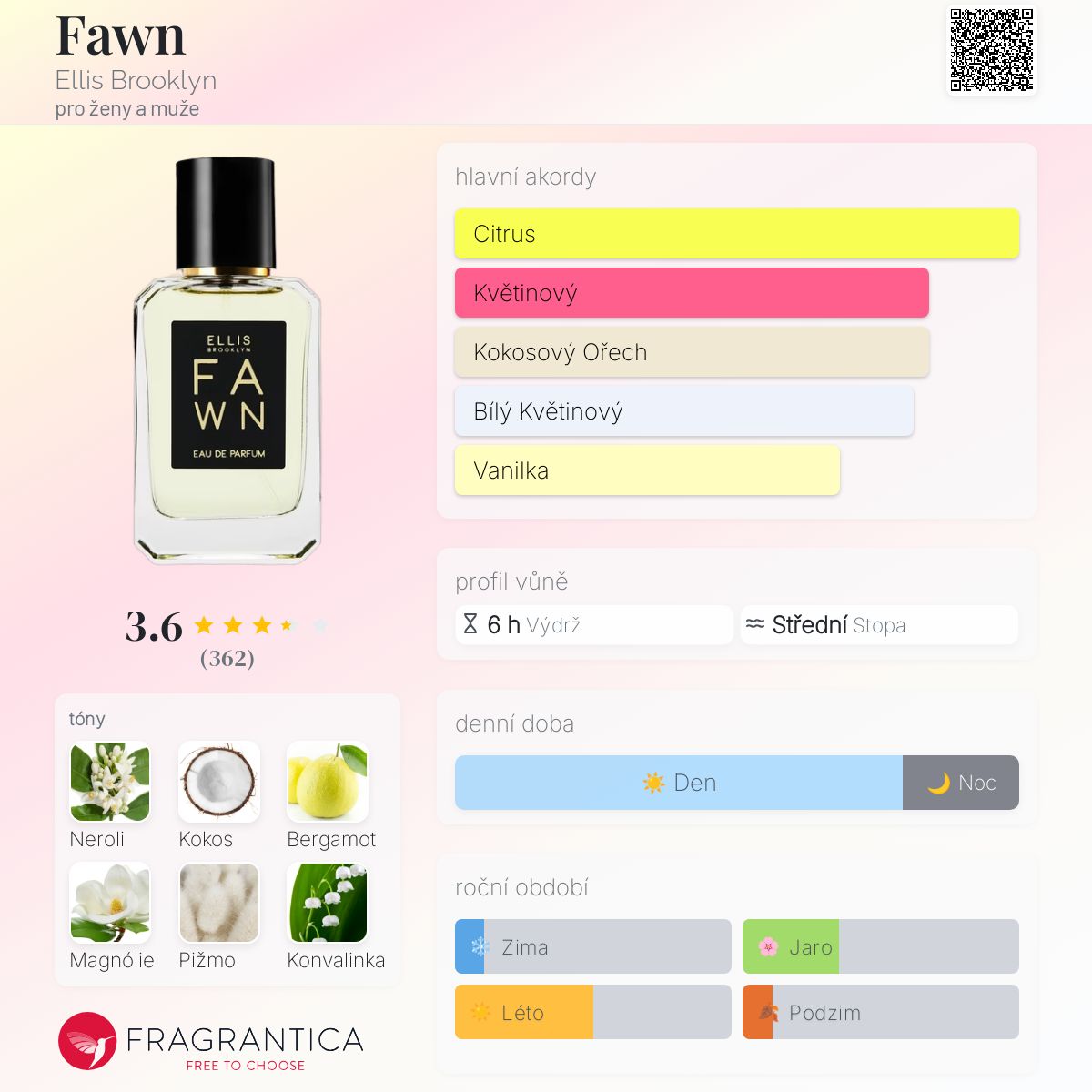 Fawn podle Ellis Brooklyn je vůně pro ženy a muže. Fawn byl/a uveden/a v roce 2018. Vrchní tóny jsou Neroli, Sicilský bergamot a Magnólie; střední tóny jsouKokosové mléko, Konvalinka a Damašská růže ; základní tóny jsou Pižmo, Vanilka a Jantar (ambra).